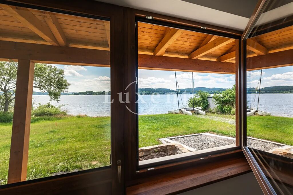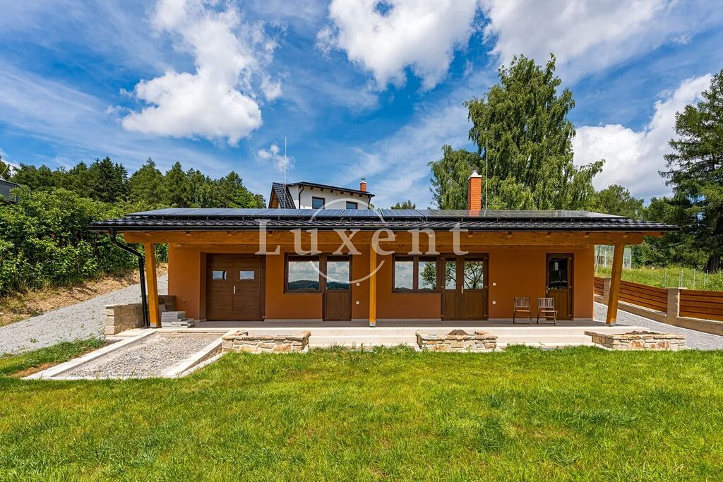 Stylový dvoupatrový rodinný dům i vedlejší stavba byly kolaudovány v říjnu 2024. Příjezd je z veřejné komunikace branou na el. pohon. Samotný RD s terasou (89 m2) stojí na vyvýšené straně pozemku a nabízí praktický interiér pro bydlení i rekreaci – zádveří s chodbou, obývací pokoj s kuchyní, krbovými kamny a výstupem na terasu, v každém patře koupelnu a ve 2. NP dvě ložnice. Z terasy v přízemí i z podkroví jsou panoramatické výhledy na jezero (viz foto). Vedlejší stavba (97 m2) v jižní části pozemku je zapuštěna do svahu, má zelenou střechu s uchvacujícím výhledem a po celé délce zastřešenou terasu opět na jezero. Součástí prostorné přízemní stavby je loděnice/kolárna, 2 víceúčelové místnosti s krbovými kamny, sauna v přípravě, koupelna a technická místnost s TČ a dalším technologickým zázemím včetně FVE pro oba domy.
