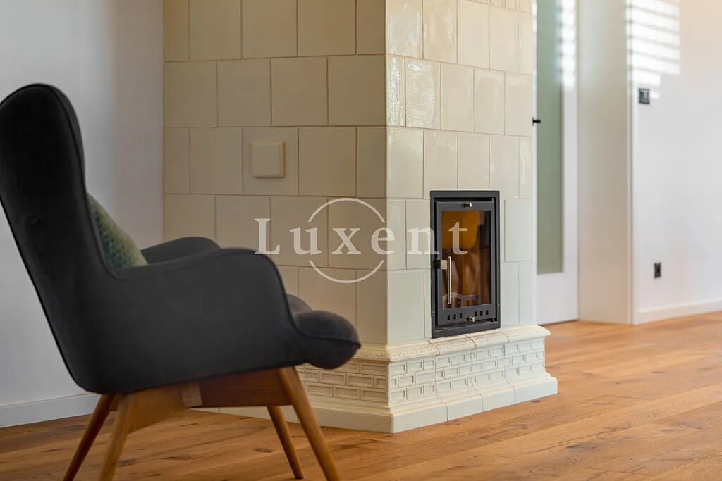 Dispozice a vybavení: dům má tři podlaží vč. částečného podsklepení s technickým zázemím. Dominantou interiéru je velkorysý obývací pokoj s otevřenou kuchyní, jídelnou s masivním dubovým stolem pro 10 osob, ručně vyráběnými kachlovými kamny a přímým vstupem na velkorysou jižní terasu (45 m²). Komfort osobního prostoru zajišťují celkem 4 ložnice (jedna v přízemí, tři v prostorném podkrovním patře s působivými dřevěnými trámy), 3 designové koupelny (hlavní koupelna se samostatně stojící vanou), 2 šatny. Praktické zázemí tvoří vstupní šatna s vestavěnými skříněmi na míru, velkorysý úložný prostor, prádelna a velká technická místnost.