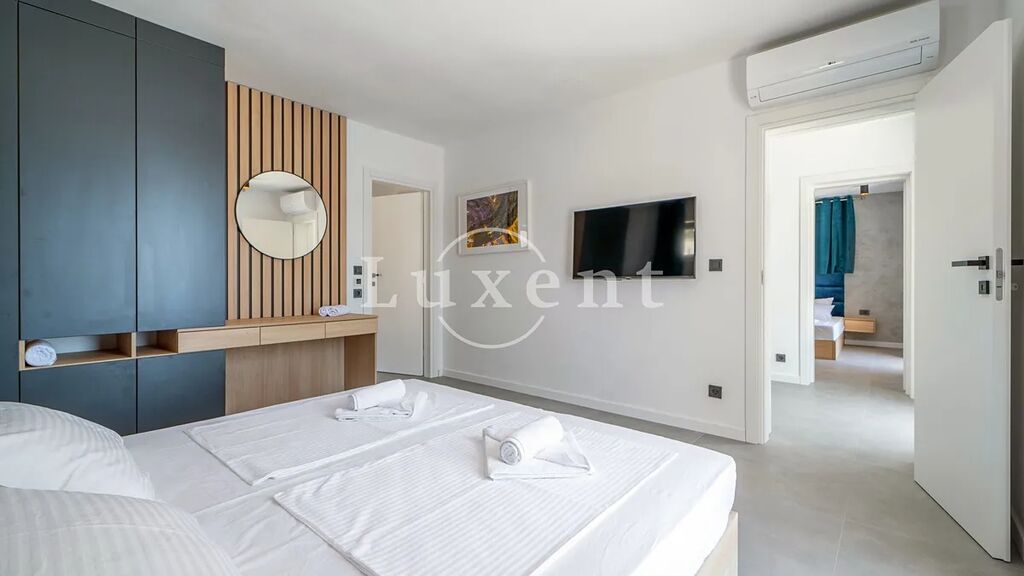 Po vnitřním schodišti se dostanete do horního patra, kde se nachází tři ložnice. Jedna z nich má vlastní koupelnu, zatímco zbývající dvě sdílejí koupelnu společnou. Všechny pokoje mají přístup na velkou terasu s dechberoucím výhledem na moře – ideální místo pro ranní kávu či večerní relaxaci.