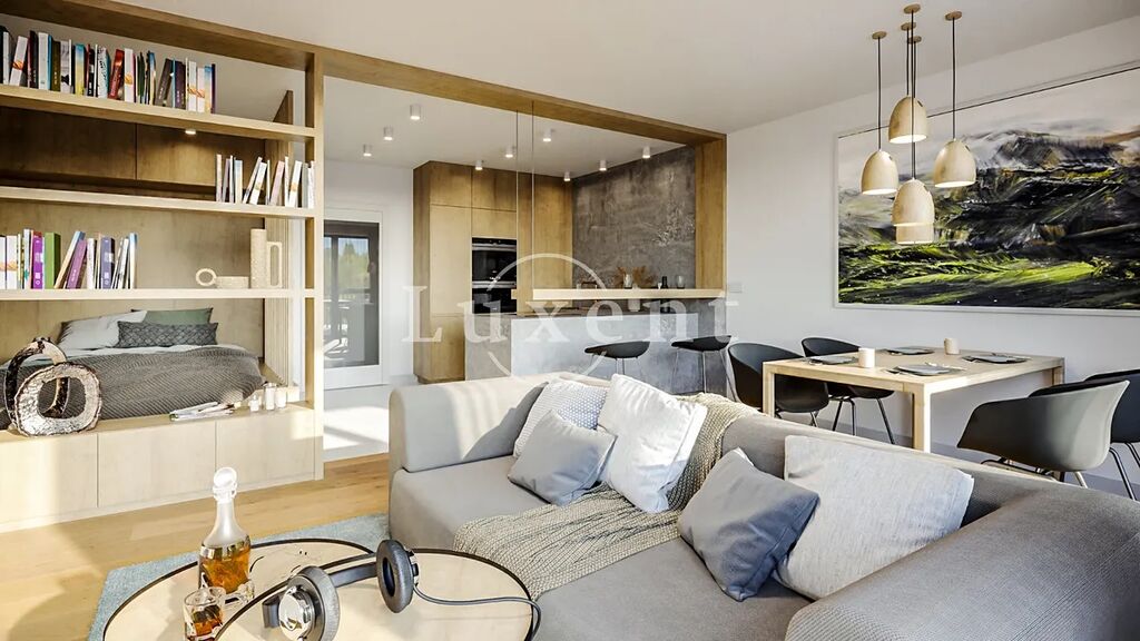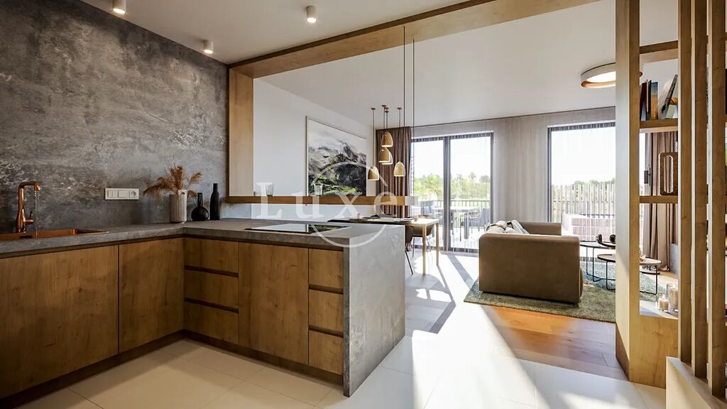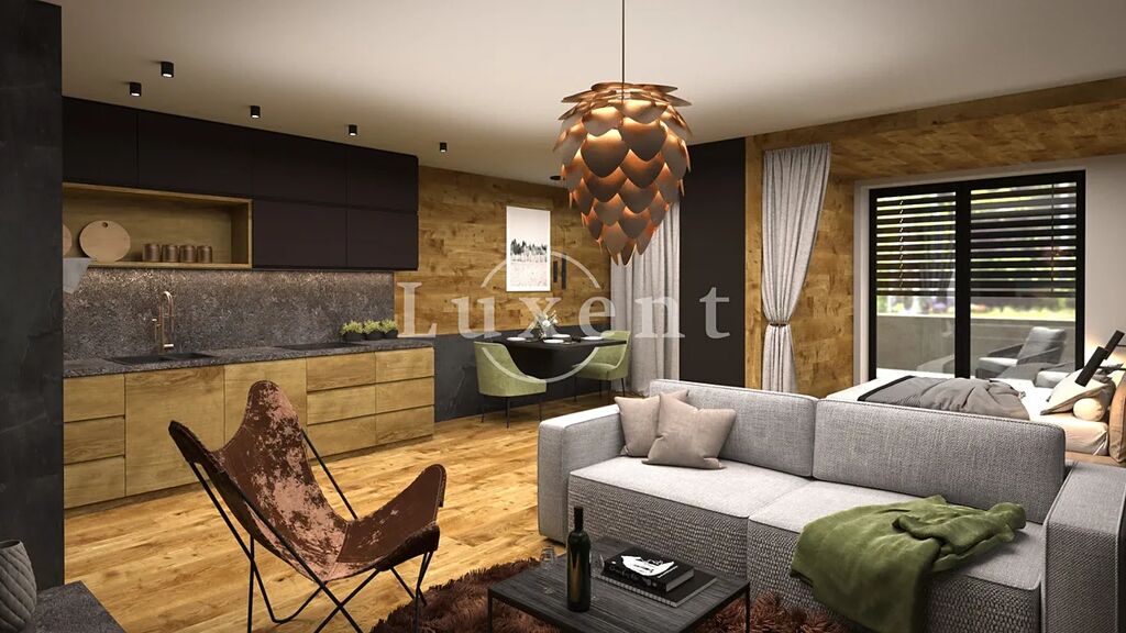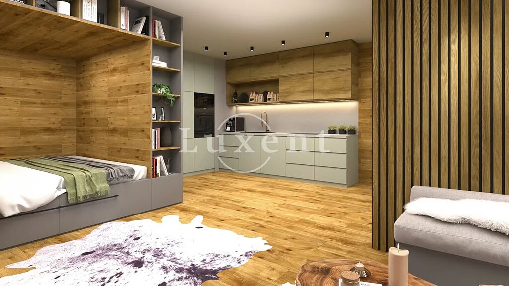 Nabízíme apartmán o dispozici 1-2+kk v 1.NP luxusního projektu HARRACHOV PEAKS. Apartmán má obytnou plochu 52,19 m² a celkovou užitnou plochu 80,16 m² vč. terasy (27,61 m²). V prostoru tohoto apartmánu získáte snadno pomocí připraveného individuálního architektonického návrhu vestavby originální dispozici blížící se 2+kk (viz vizualizace). Terasa apartmánu je vůči zemi vyvýšená a odpovídá 2. NP. Vybavený vzorový byt projektu má stejnou dispozici, takže je možné se inspirovat. Je zařízen kuchyní (spotřebiče BEKO) a skříňová vestavba odděluje spací a jídelní kout a apartmán se tak přibližuje dispozici 2+kk.