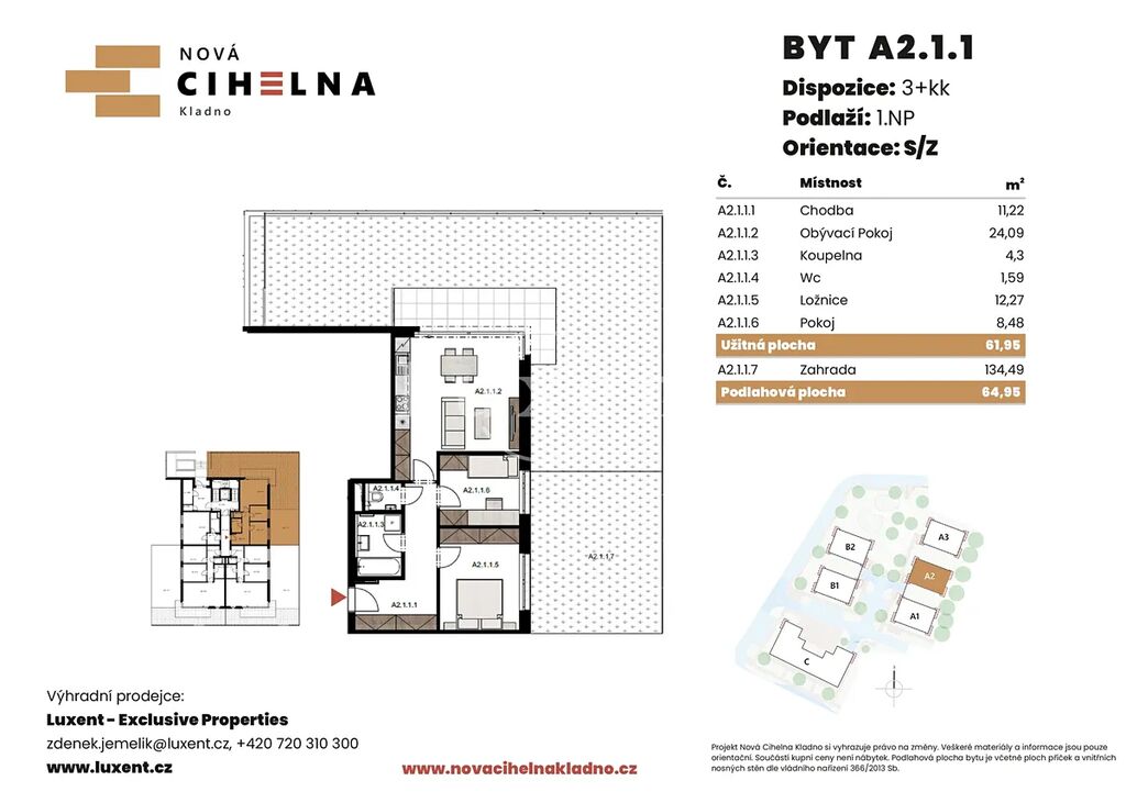 Nabízíme k prodeji byt 3+kk o podlahové ploše 64,95 m² se zahradou 134,49 m² v mimořádně úsporném developerském projektu Nová Cihelna Kladno vznikajícím v městské čtvrti Kladno – Rozdělov.