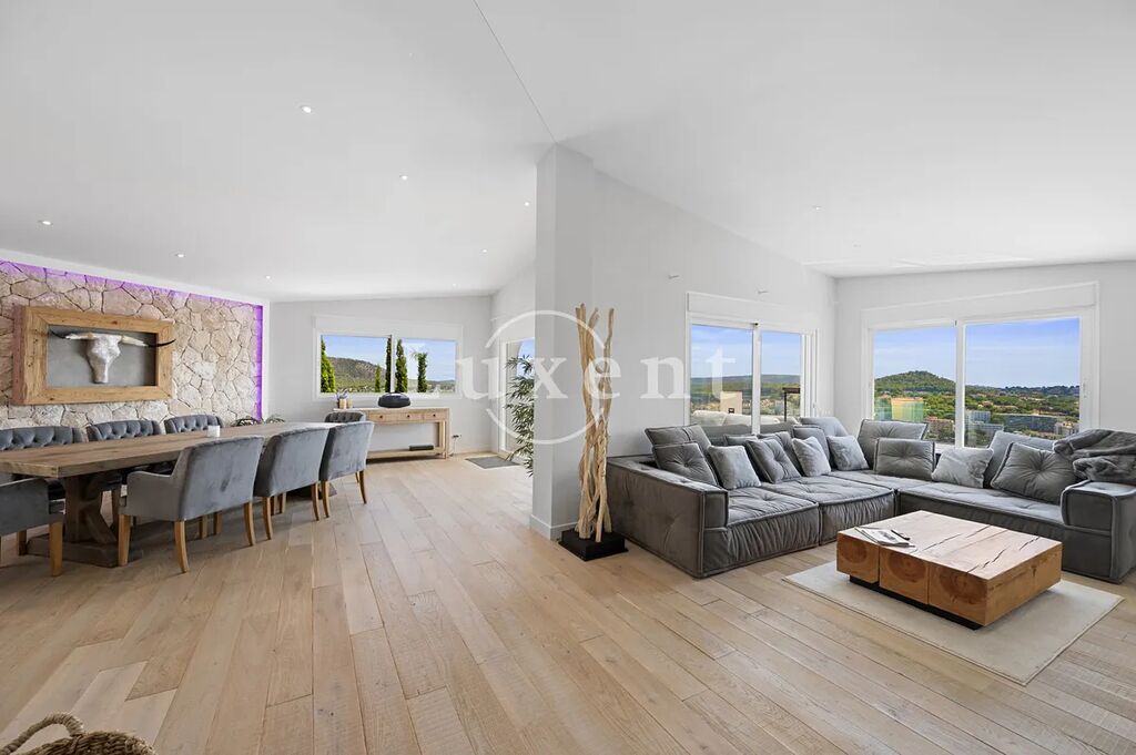 Prostorný a otevřený obývací pokoj s jídelnou je ideální pro společenské akce, a moderní kuchyně je vybavena špičkovými spotřebiči včetně vinotéky, trouby Miele, varné desky Bora s ostrůvkovým řešením, dvou velkých kombinovaných lednic s mrazničkou, myčky na nádobí, kávovaru Miele a šuplíky na ohřev nádobí. Částečně krytá terasa nabízí skvělé místo k odpočinku s nádherným výhledem.