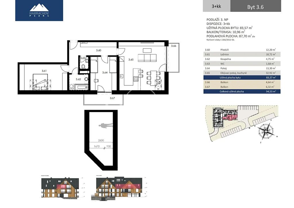Nabízíme apartmán o dispozici 3+kk ve 3. NP luxusního projektu HARRACHOV PEAKS. Apartmán má obytnou plochu 87,7 m2 (ve světlé podchozí výšce nad 1,2 m je to 81,2 m2) a celkovou užitnou plochu 94,53 m2 se dvěma balkony (4,6 a 6,3 m2). Projekt je dokončen a zkolaudován a k dispozici je už vzorový byt. V suterénu je majitelům k dispozici wellness se saunou a vířivkou a vybavené fitness.