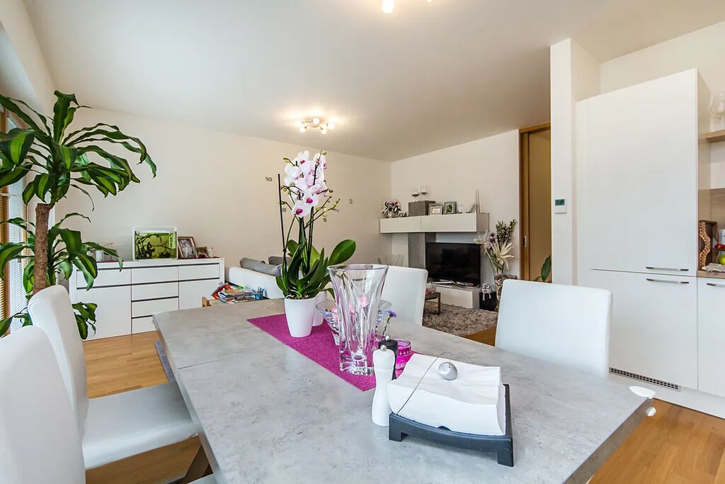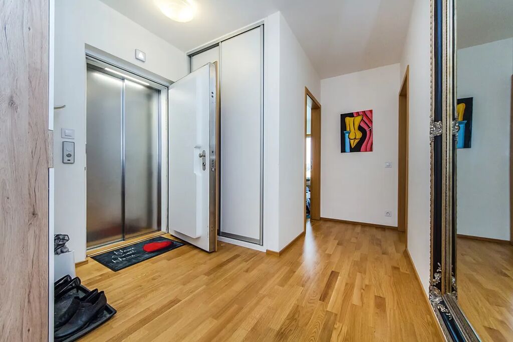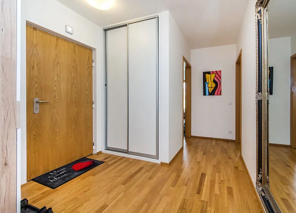 Do bytu vcházíte přímo z výtahu. Interiér tvoří vstupní hala, prostorný obývací pokoj s plně vybavenou kuchyňskou linkou, dvě samostatné ložnice a dvě koupelny – jedna s vanou, druhá se sprchovým koutem. K dispozici je rovněž praktická technická místnost s pračkou a dalším úložným prostorem. Z obývací části je přístup na terasu s výhledem do vnitrobloku. Z ložnic je výhled směrem k řece.