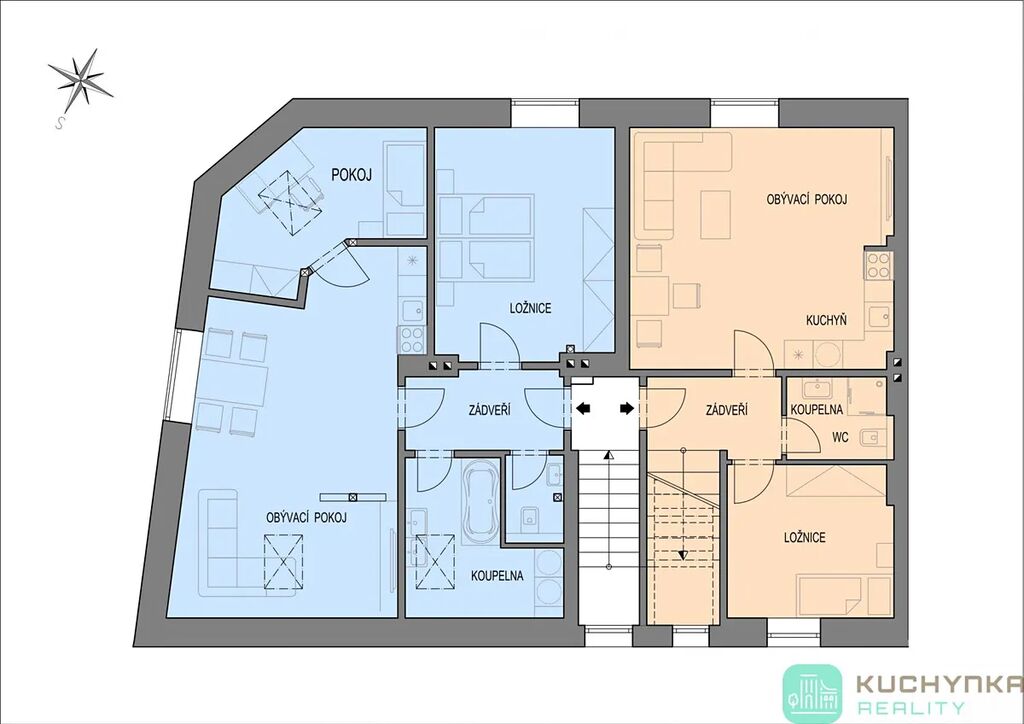 Na půdorysu je byt vyznačený oranžově na pravé straně.