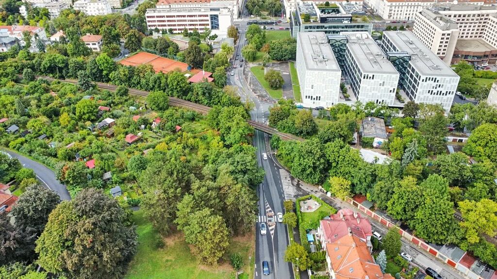 Metro Dejvická 500 m a tramvajová zastávka Thákurova 300 m od garáže.