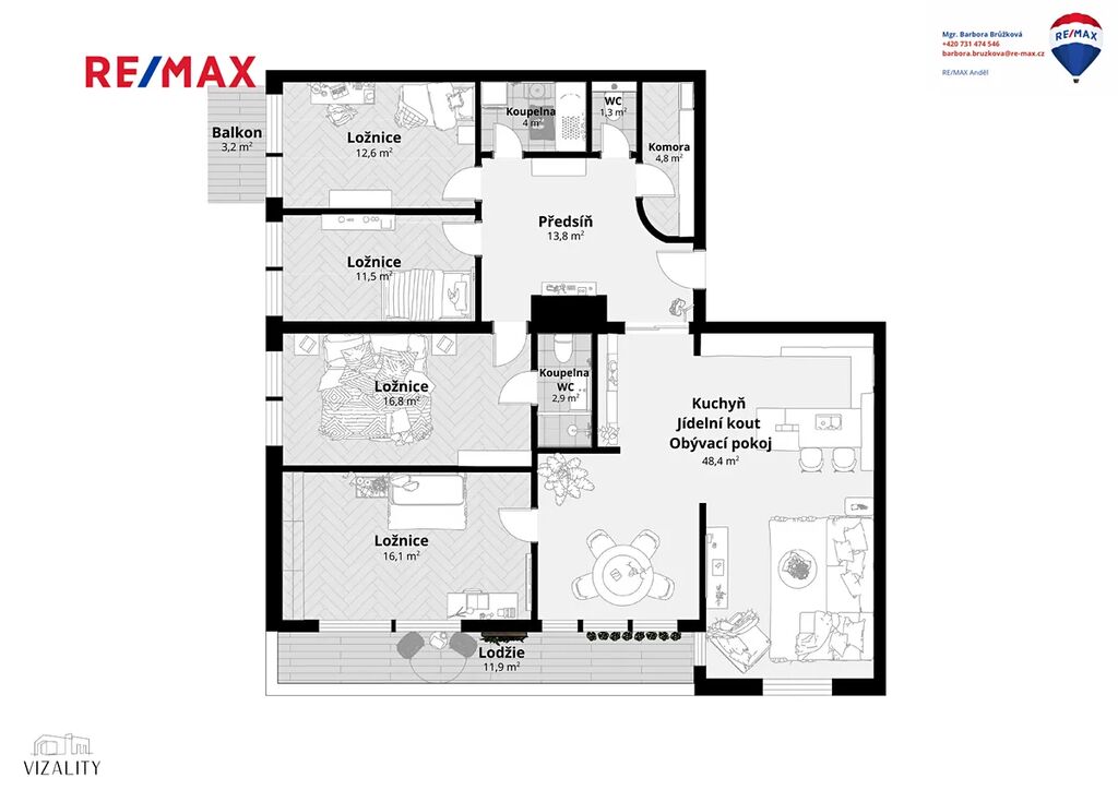 Byt dále nabízí tři neprůchozí ložnice, z nichž jedna má vstup na balkon (3,1 m2) , druhá má vlastní en - suite koupelnu. Další koupelna v bytě je vybavena vanou, prostorem pro pračku a sušičku, samostatná toaleta. Prostorná centrální vstupní chodba, samostatná velkorysá šatna s dostatkem úložných prostor.