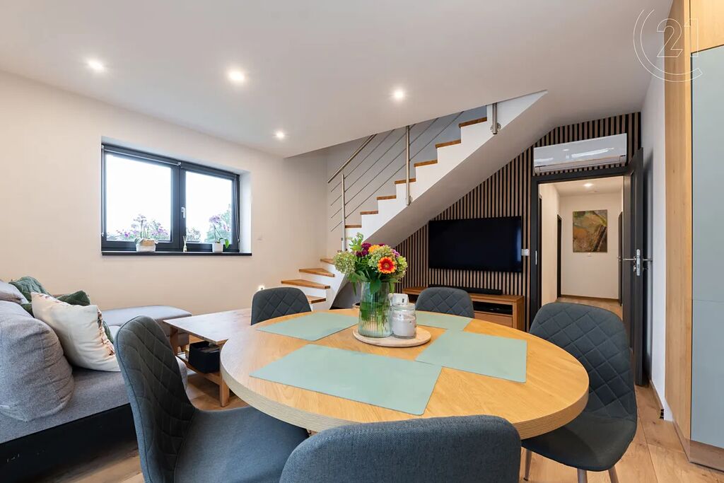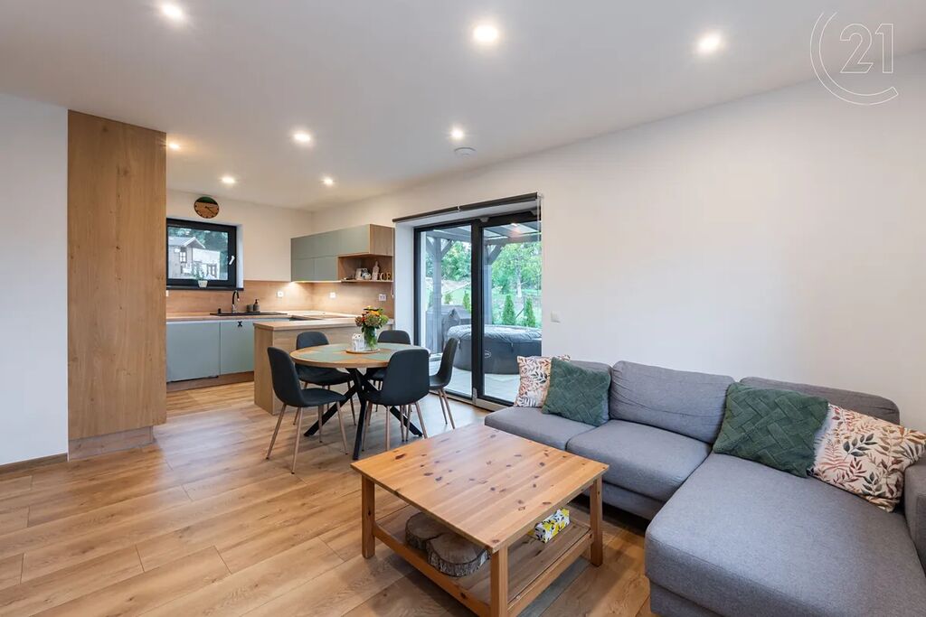 přízemí: útulný obývací pokoj s moderní kuchyní a vstupem na terasu, dva prostorné neprůchozí pokoje, koupelna s WC, samostatná toaleta, komora a technická místnost,