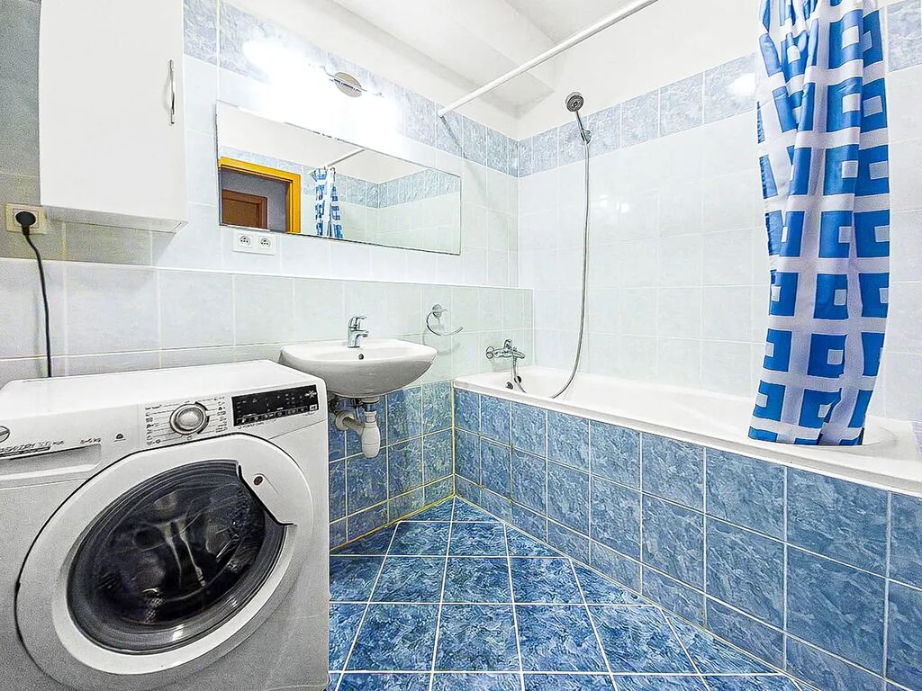 Koupelna disponuje vanou, umyvadlem, toaletou a moderními obklady v nadčasových barevných tónech.