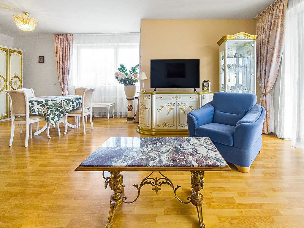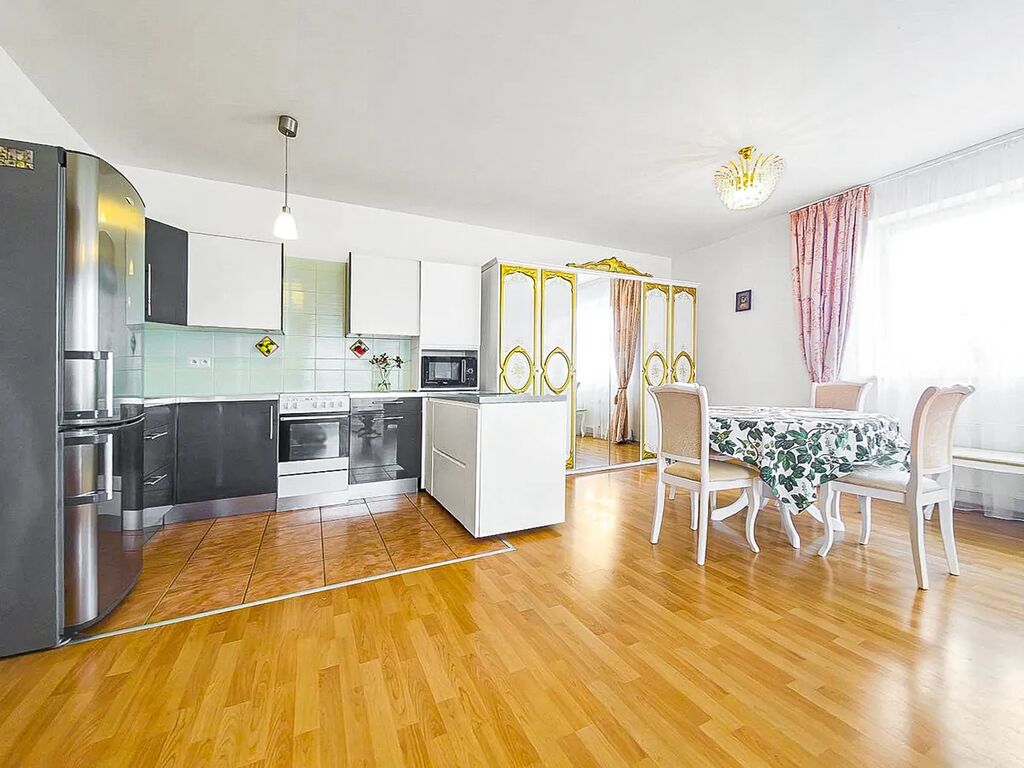 Obývací pokoj s kuchyňským koutem tvoří centrální část bytu. Světlý a prostorný interiér je vybaven elegantním nábytkem a působí reprezentativně i útulně zároveň. Kuchyňská linka je osazena moderními spotřebiči a poskytuje dostatek úložného prostoru. Z obývací části je přímý vstup na balkon, který nabízí možnost příjemného posezení s výhledem do okolí.