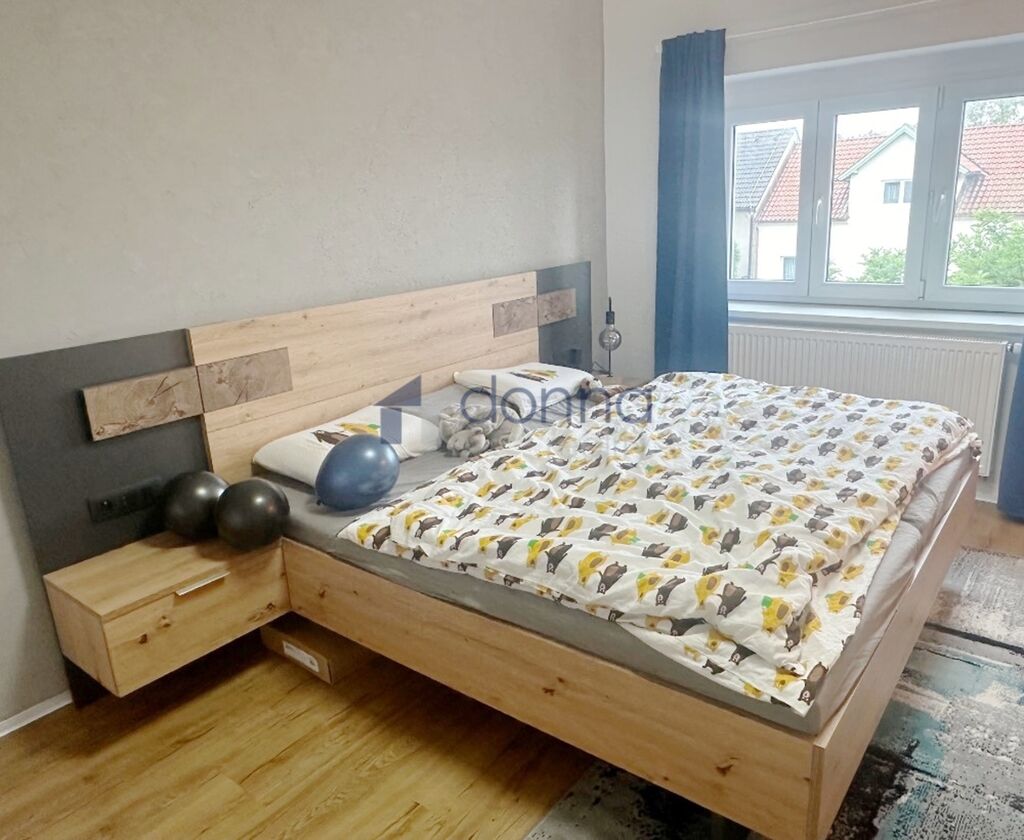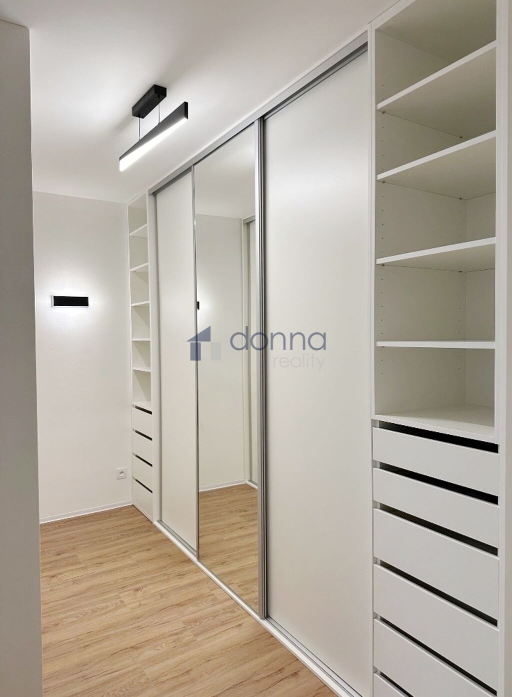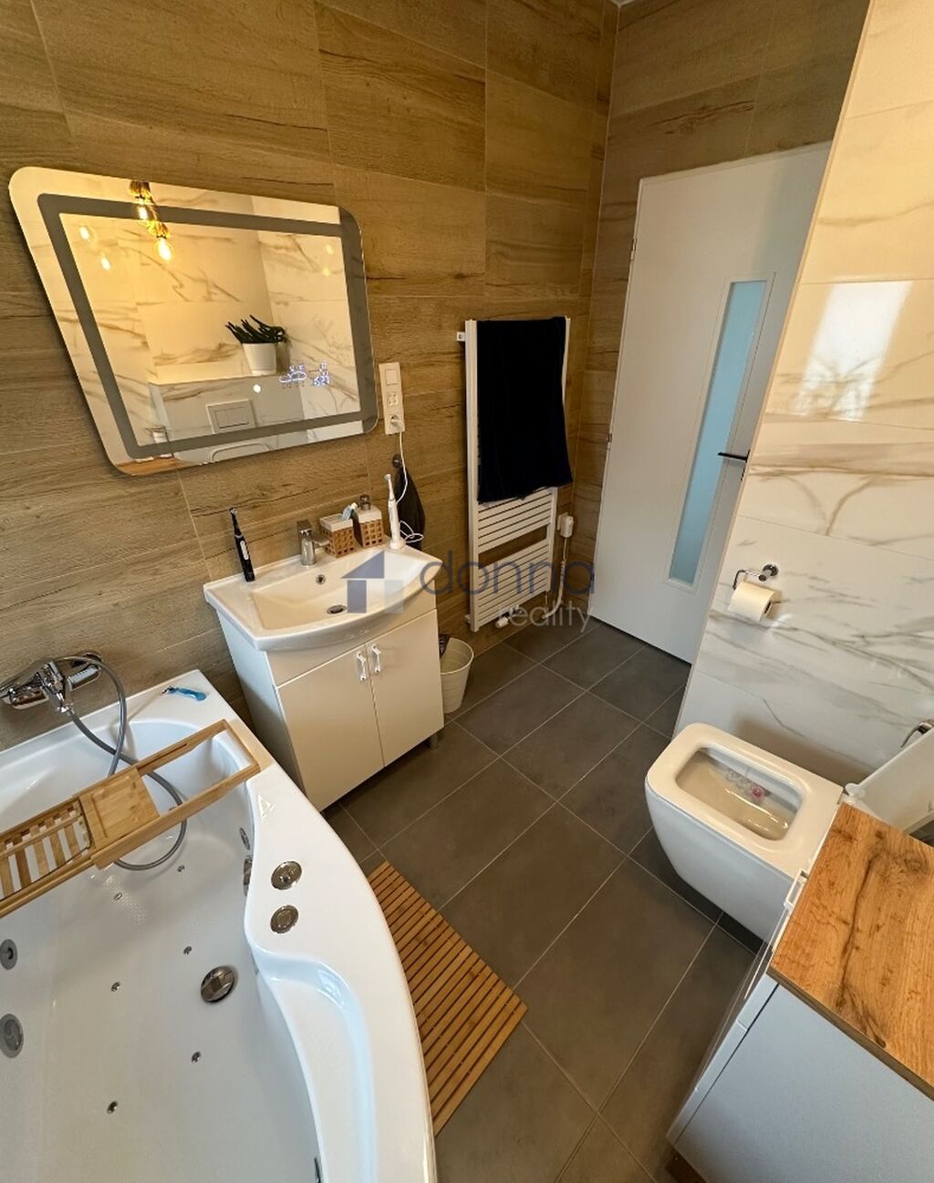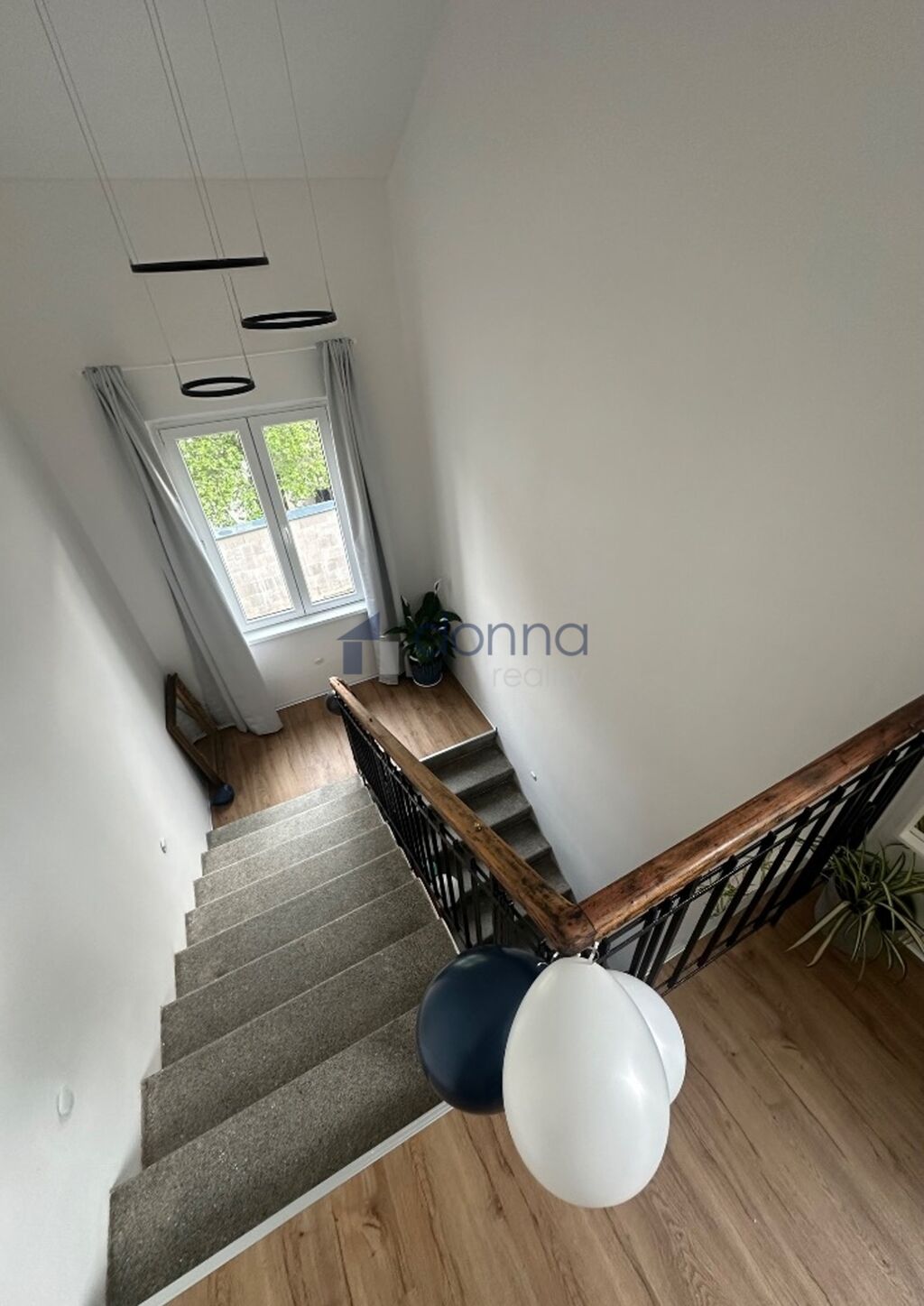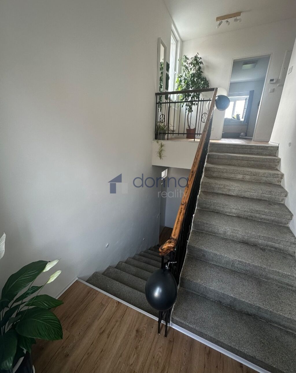 První patro: koupelna s hydromasážní vanou a toaletou, ložnice, šatna spojená s druhým soukromým obývacím pokojem a dále volný pokoj.