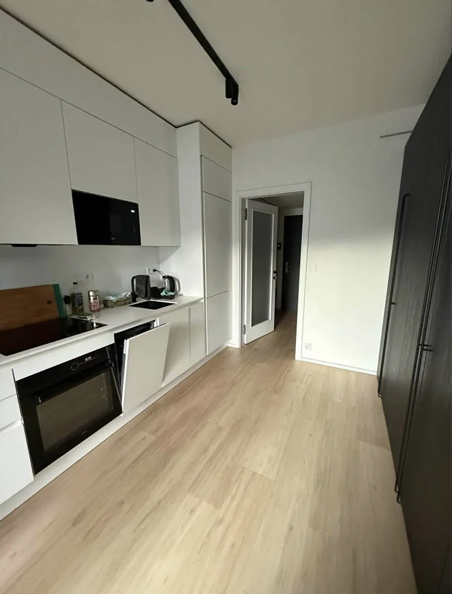 Byt nabízí světlou obytnou místnost s moderní kuchyňskou linkou vybavenou spotřebiči, balkon s příjemným výhledem do klidného vnitrobloku, chytrý systém Loxone (smart home) pro komfortní ovládání domácnosti, vestavěné úložné prostory a vysokorychlostní internet.
