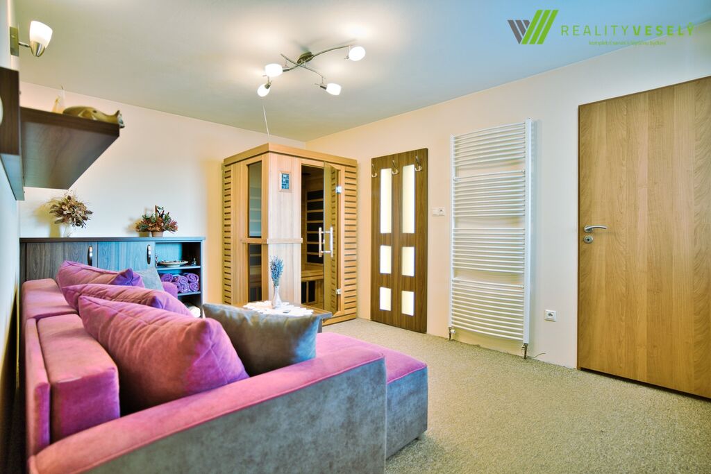 Suterén domu je díky sklepním oknům světlý a dobře využitelný – najdete zde skladové prostory, technické zázemí, vlastní studnu a prostornou průjezdnou garáž se sekčními vraty. Parkování je možné nejen v garáži, ale i na pozemku před domem.