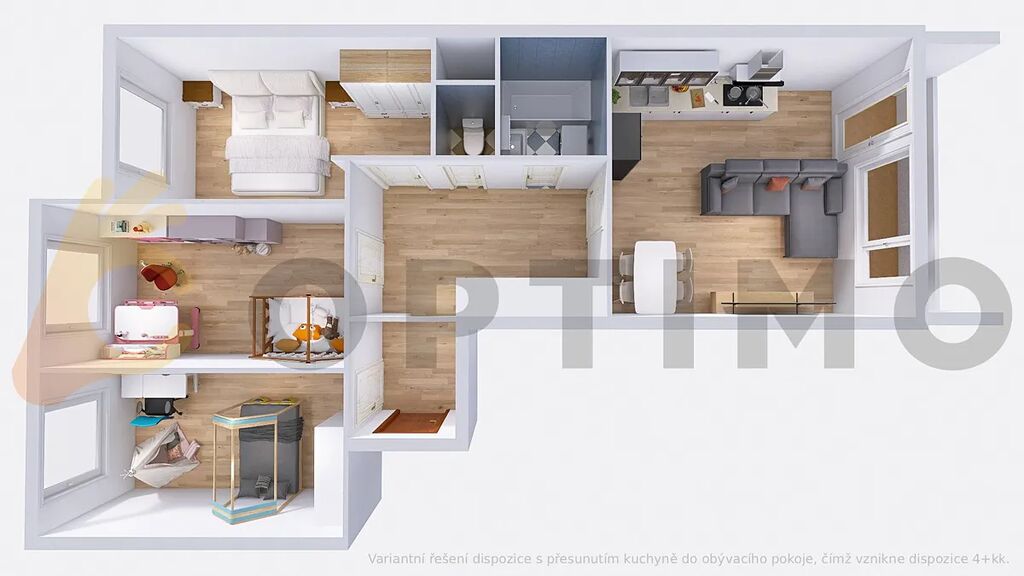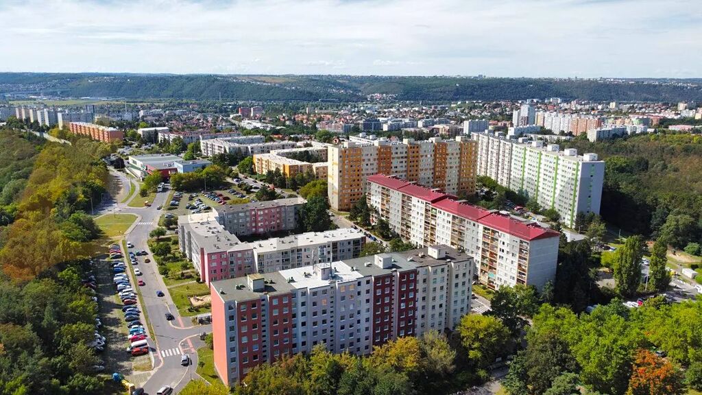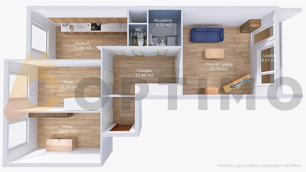Byt je řešen prakticky – dvě ložnice (12,1 m² a 12 m²) jsou orientovány na sever, obývací pokoj (20,8 m²) s přímým vstupem na lodžii směřuje na jih. Kuchyň (11,7 m²) může zůstat samostatná, nebo ji lze přesunout do obývacího pokoje a tím vytvořit třetí ložnici. Koupelna (3,1 m²) a WC (1 m²) jsou zděné. K bytu náleží také sklepní prostor (4 m²), ideální pro úložné věci či sportovní vybavení. Celková užitná plocha včetně příslušenství činí 77 m².