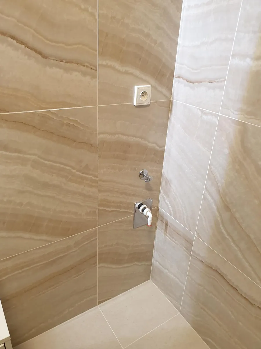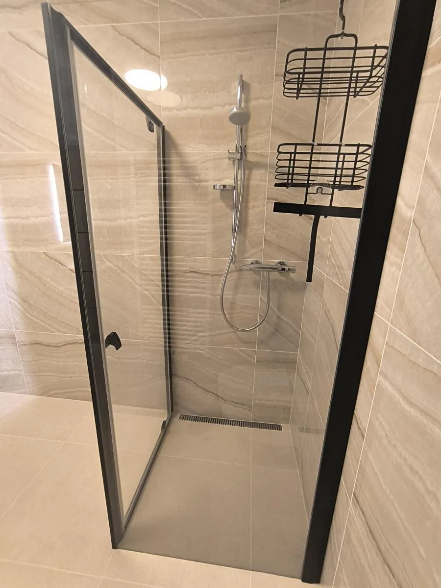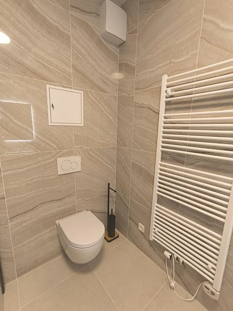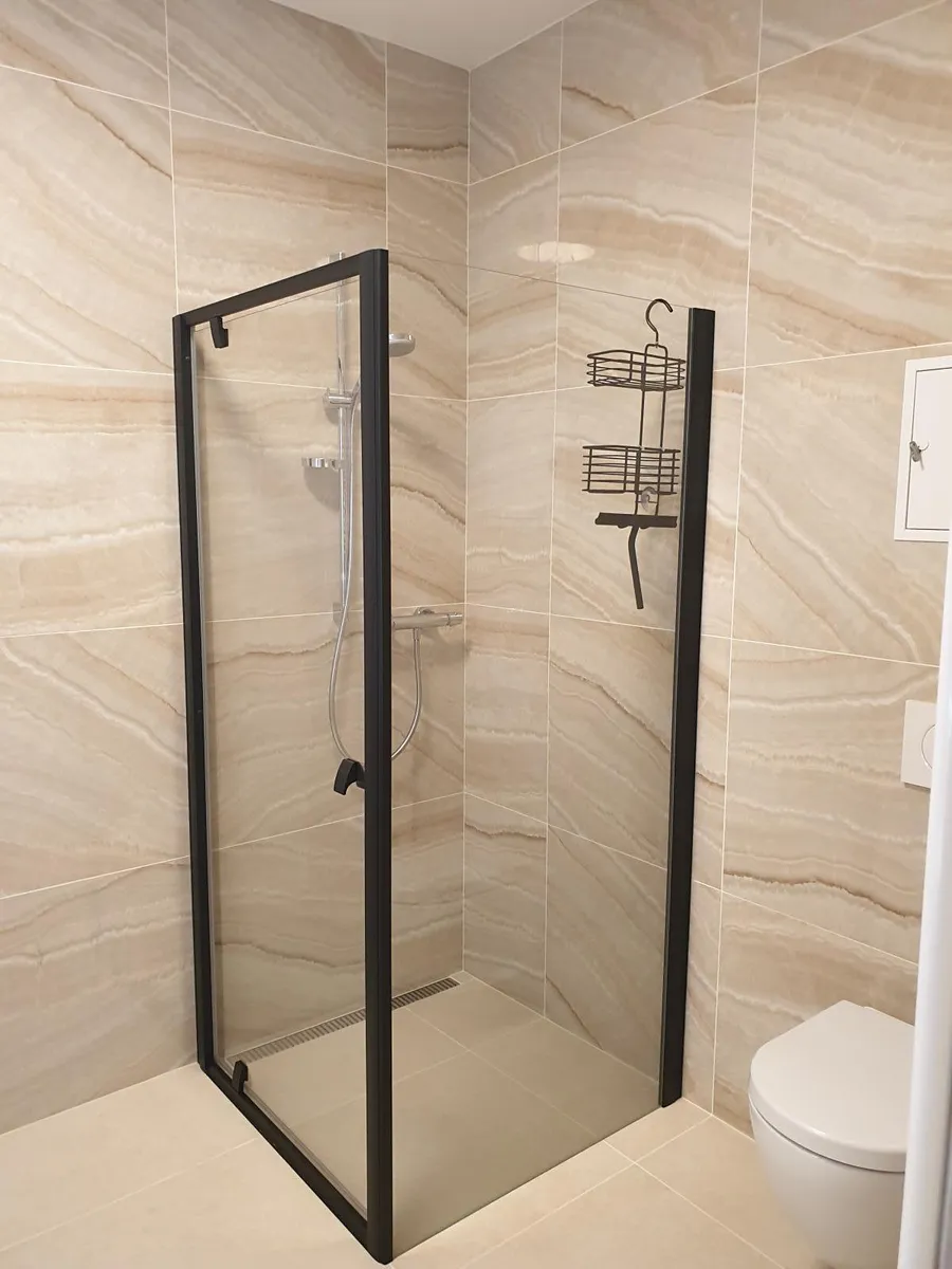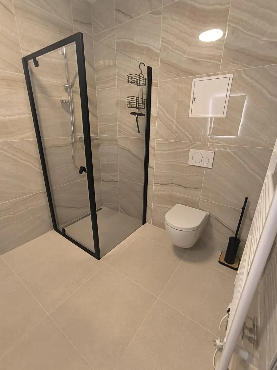 koupelna se sprchovým koutem, toaletou a přípravou na pračku