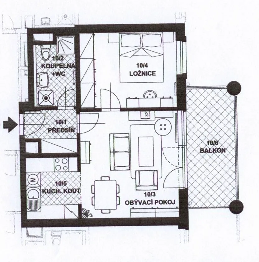 Oba pokoje mají pěkný, volný výhled do zeleně. Plochy místností jsou: obývací pokoj s 18,34m2, kuch. kout 5,66 m2, ložnice 12,49 m2, koupelna s WC 4,78 m2, předsíň 3,68 m2 a terasa 9,83 m2. K dispozici je zabezpečená zděná sklepní kóje o ploše 3 m2. K dispozici je možnost využití příjemného vnitrobloku domu s posezením.
