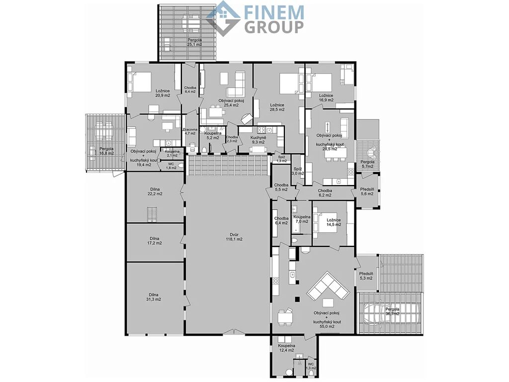 - pergoly navazující na obytnou část, vhodné pro venkovní posezení,