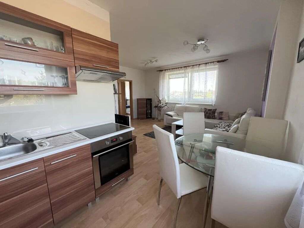 Dispozice a vybavení: Prostorný obývací pokoj s kuchyňským koutem v moderním provedení. Kuchyňská linka s vestavěnými spotřebiči a dostatkem úložných skříní. Ložnice pojme manželskou postel i skříně. Podlahy v kombinaci vinylové podlahy a dlažby. Plastová okna s dvojsklem. Byt je v udržovaném stavu, připraven k okamžitému nastěhování.