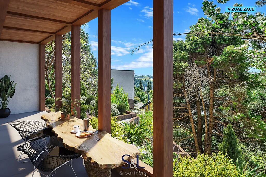 - Zahrada s mírným svahem a výhledem, částečně upravená jako skalka, osazena vzrostlými stromy – příjemné místo pro zahradničení, relaxaci nebo vytvoření soukromé zóny pro odpočinek.