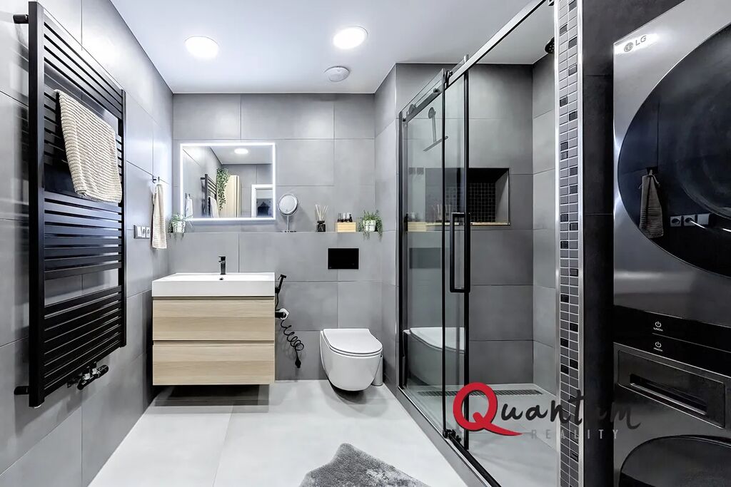 Velká koupelna s komfortním sprchovým koutem, toaletou a prostorem pro pračku i sušičku
