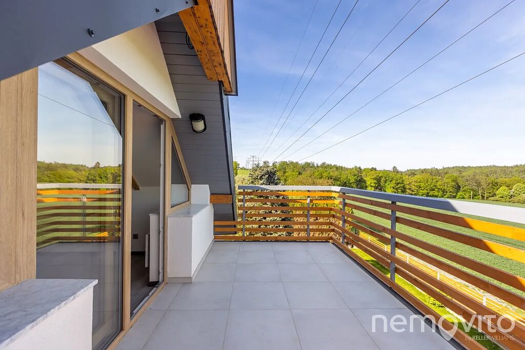 Dominantou je mimo zmíněného obýváku, ze kterého je výstup na terasu k bazénu, také hala se schodištěm, které propojuje obě podlaží. Všechny pokoje jsou nahoře, přičemž jedna z částí může fungovat zcela samostatně (vlastní koupelna, připojení na další kuchyni). V této ložnici s proskleným štítem je skutečně působivý výhled z balkonu, který je nad garáží. Následují dva menší pokoje a další sekce, která má vlastní koupelnu i šatnu. Nahoře jsou tak celkem 3 koupelny a možnost samostatného fungování dvou pokojů. Nechybí také velká, plně pochozí a čistá půda.
