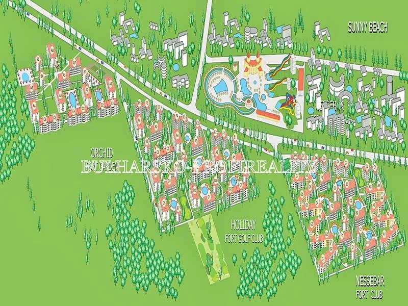 Komplex Orchidea Fort Club (nebo Fort Garden) se nachází v klidnější části Slunečného pobřeží a obvykle je součástí většího rezidenčního areálu s bohatou infrastrukturou: