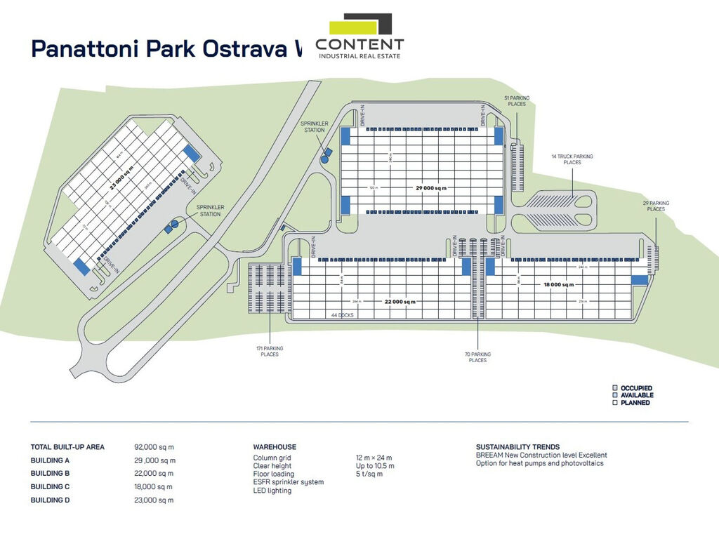 - samostatné prostory v budově C, až 19200 m², lze dělit od 5000 m²,