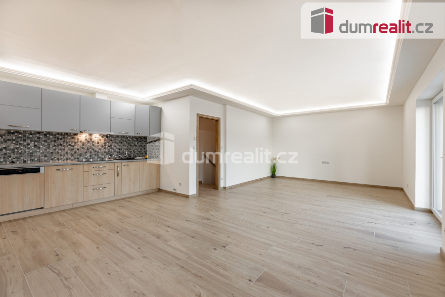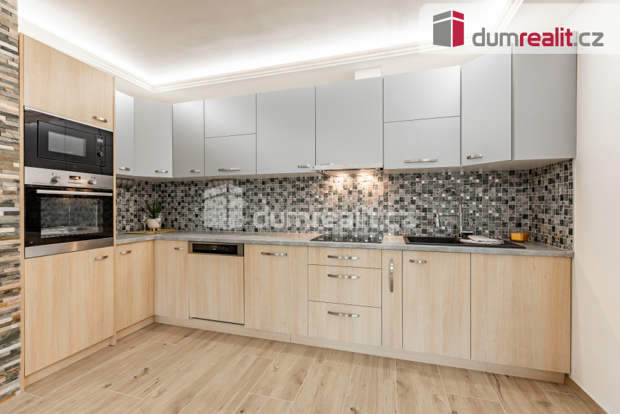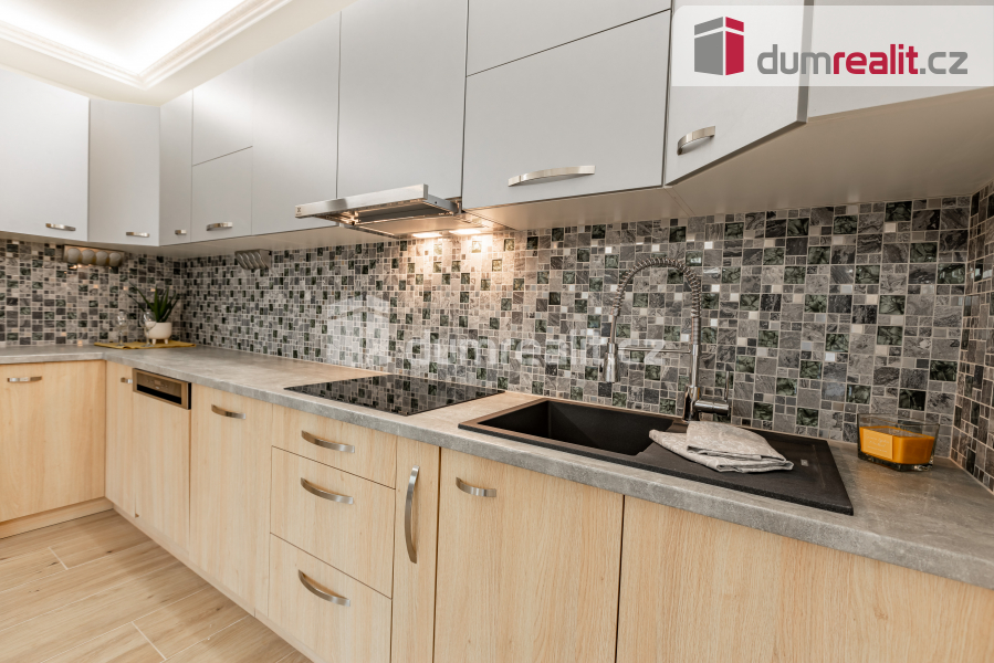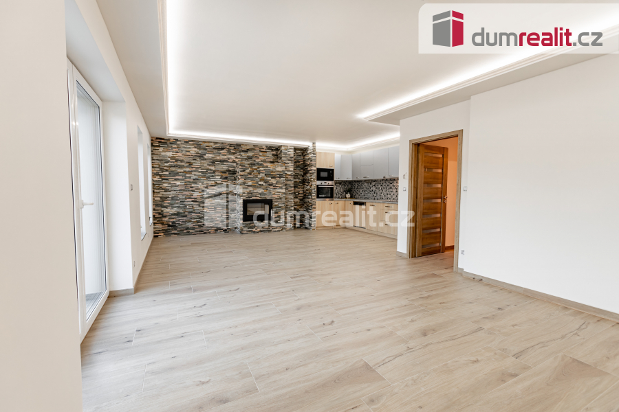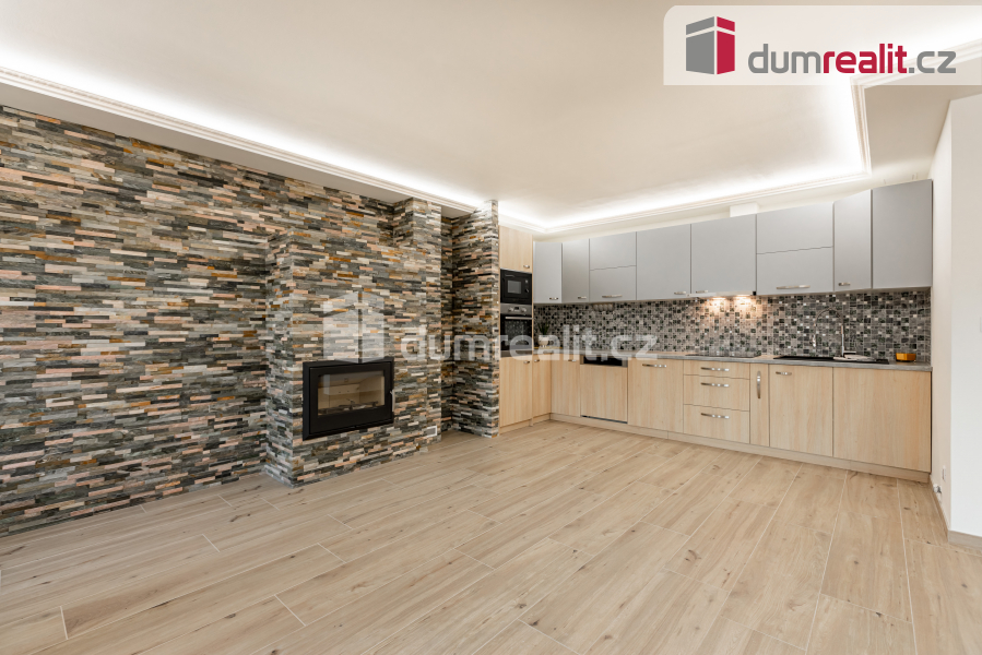 Kuchyně je zařízená moderní kuchyňskou linkou, v obývací části krb.