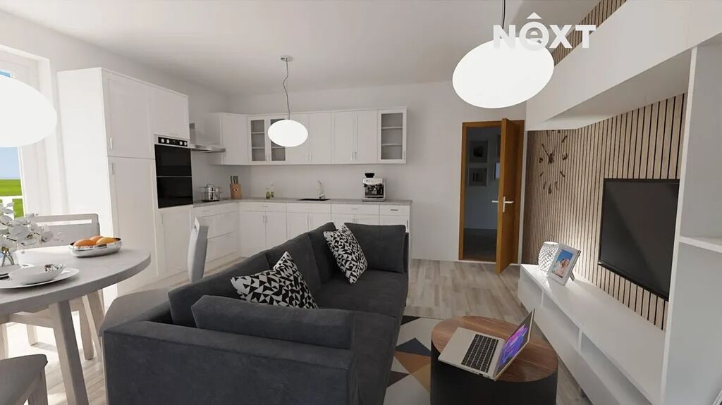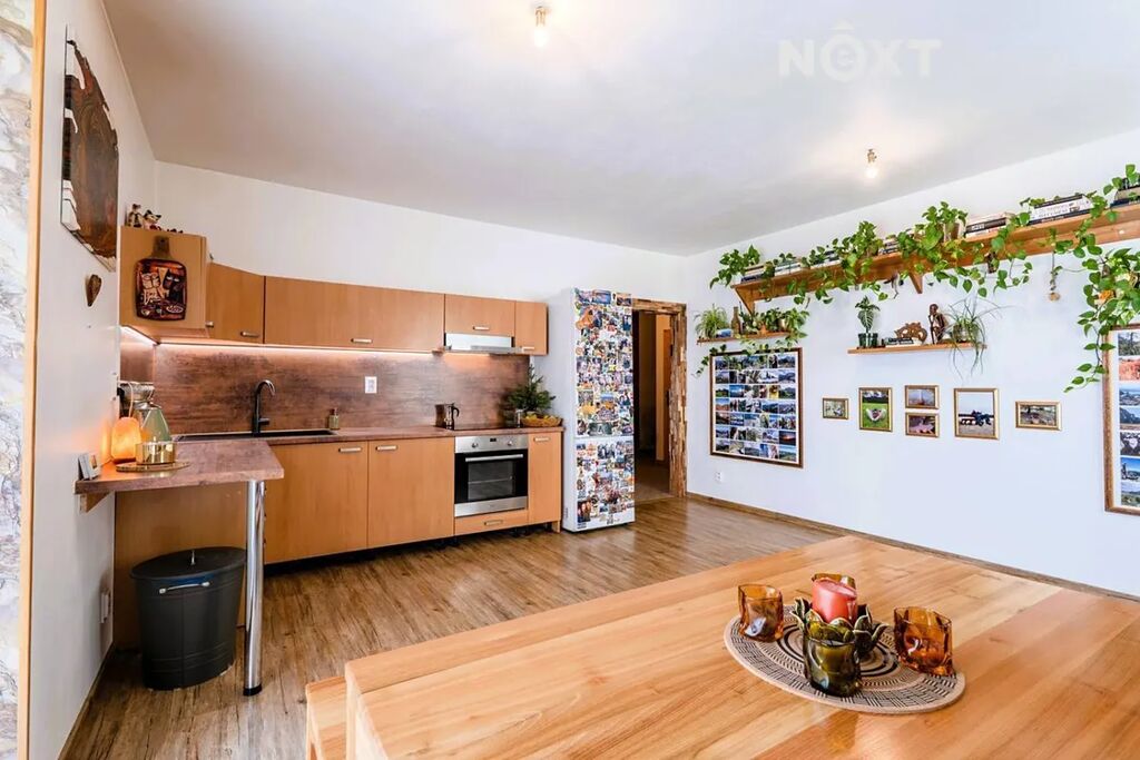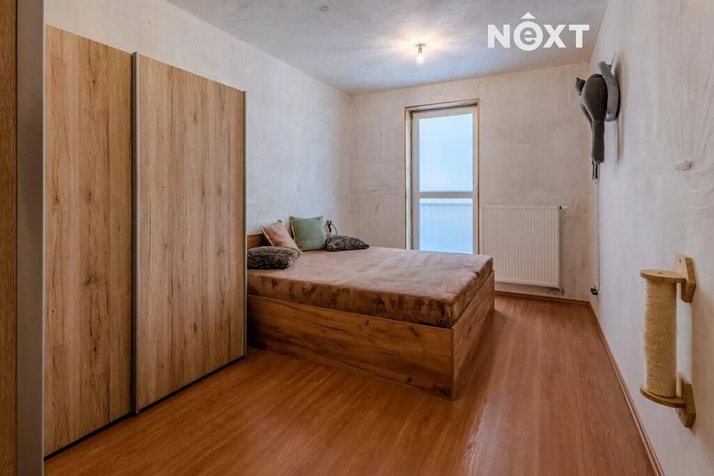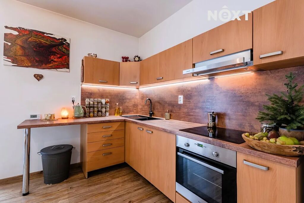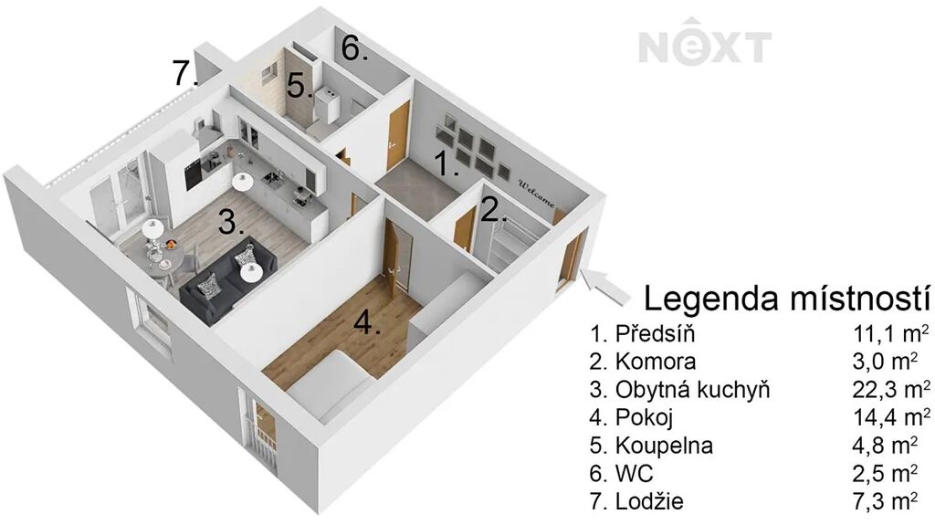 V bytě je dispozici prostorná předsíň (11,1 m2), ze které jsou vstupy do jednotlivých místností - do ložnice (14,4 m2) a do obytné kuchyně (22,3 m2), která současným majitelům slouží jako velmi prakticky jednoduše zařízená kuchyň, ale ve skutečnosti se zde nachází dost prostoru nejen pro kuchyňský kout s jídelním stolem, ale i dost místa pro vytvoření obývací části s pohodlnou pohovkou a konferenčním stolkem. Ranní kávu si za teplých dní můžete vychutnat v lodžii (7,3 m2) navazující přes PSK portál přímo na tento obytný prostor. PSK portál stejně jako všechna okna v bytě má trojsklo. Z chodby je dále vstup do koupelny (4,8 m2) s umyvadlem a vanou, na samostatné WC (2,5 m2) a do komory ( 3 m2).