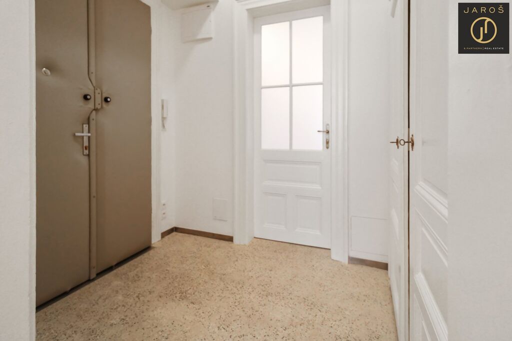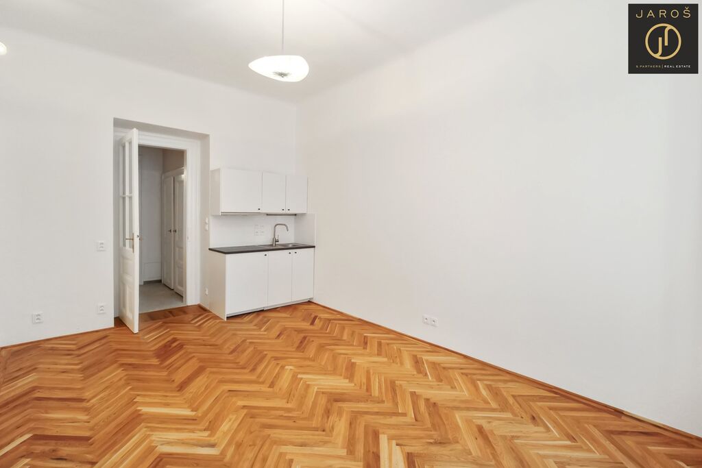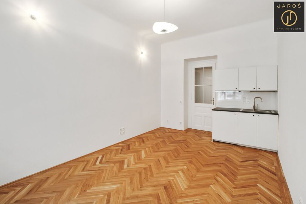 Nabízíme Vám k pronájmu světlý byt s dispozicí 2+kk (možno rozdělit na dvě samostatné jednotky se sdílenou koupelnou s wc) o celkové výměře 44m2 v oblíbené a klidné lokalitě Praha – Vršovice po celkové citlivé rekonstrukci (ulice Na Spojce). Byt o celkové výměře 44 m2 se nachází v prvním patře historického cihlového domu s vysokými stropy, 2 min od zastávky tramvaje (22,4,13), dále 2 zastávky od metra nám. Míru. Je po celkové rekonstrukci (stoupačky, zrenovovaná špaletová dřevěná okna a původní dveře, kompletně nová koupelna, zcela nové povrchy, nová parketové dubová podlahy v pokojích, původní doplňky, svítidla). Byt je základně vybavený a připravený k nastěhování. Ložnice má okno do zeleného vnitrobloku a je zde udělaná příprava rozvodů pro umístění případné druhé kuchyňské linky. V pokoji do ulice je umístěná kuchyně se základním vybavením (vestavěná pračka a digestoř, dřez, úložné prostory). Byt lze tedy užívat i s oddělenými pokoji s kuchyněmi a společnou koupelnou a halou. Pokoje nejsou průchozí a ústí do společné haly, z které je vstup do koupelny s wc a sprchovým koutem. V bytě jsou využity prostory pro ukládání potřeb v koupelně a hale. V pokojích jsou pod okny umístěny nové radiátory, v koupelně a hale je podlahové vytápění a otopný elektrický žebřík. V koupelně je dále plynový kotel nad wc. Ve všech prostorech jsou osvětlovací tělesa.