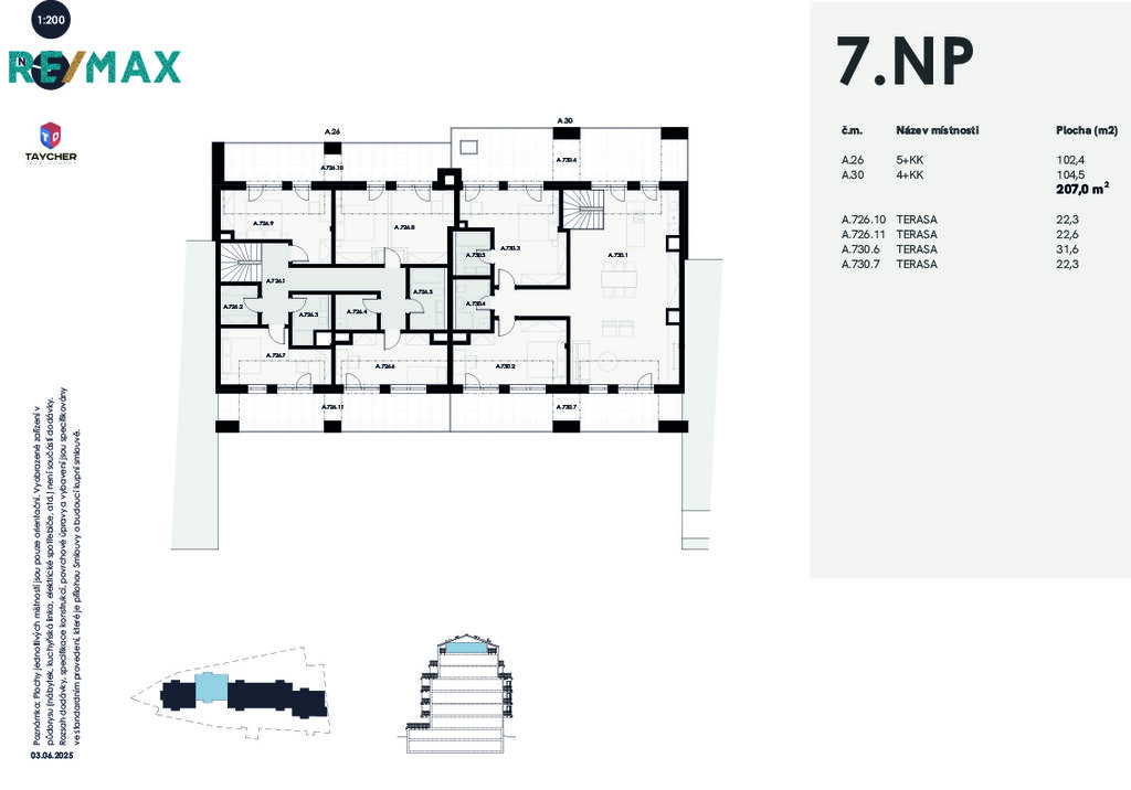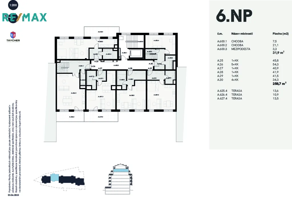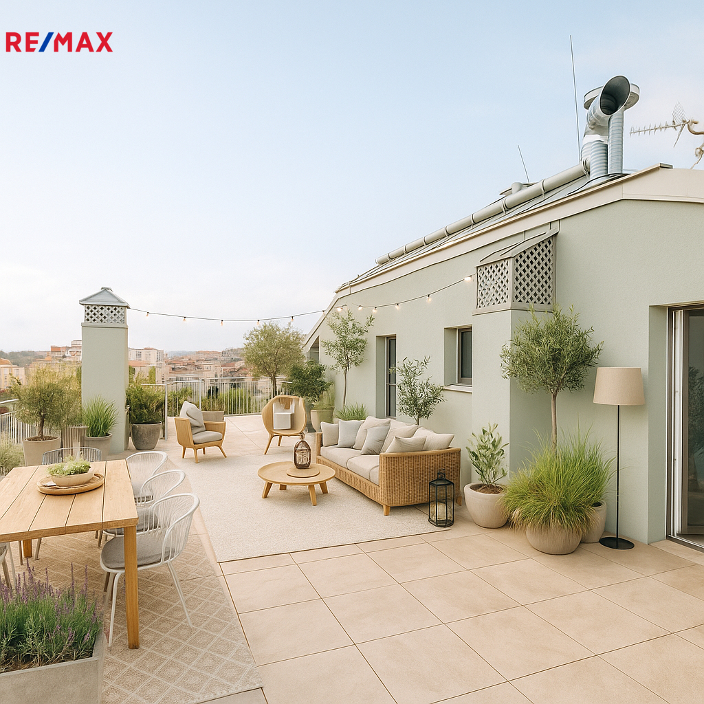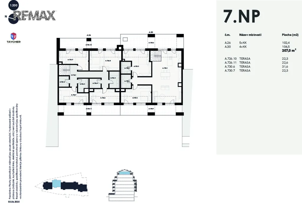 Byt disponuje dvěma terasami (31,6 m² a 22,3 m²), sklepní kójí (5,3 m²) a možností dokoupení parkovacího místa v podzemní garáži.