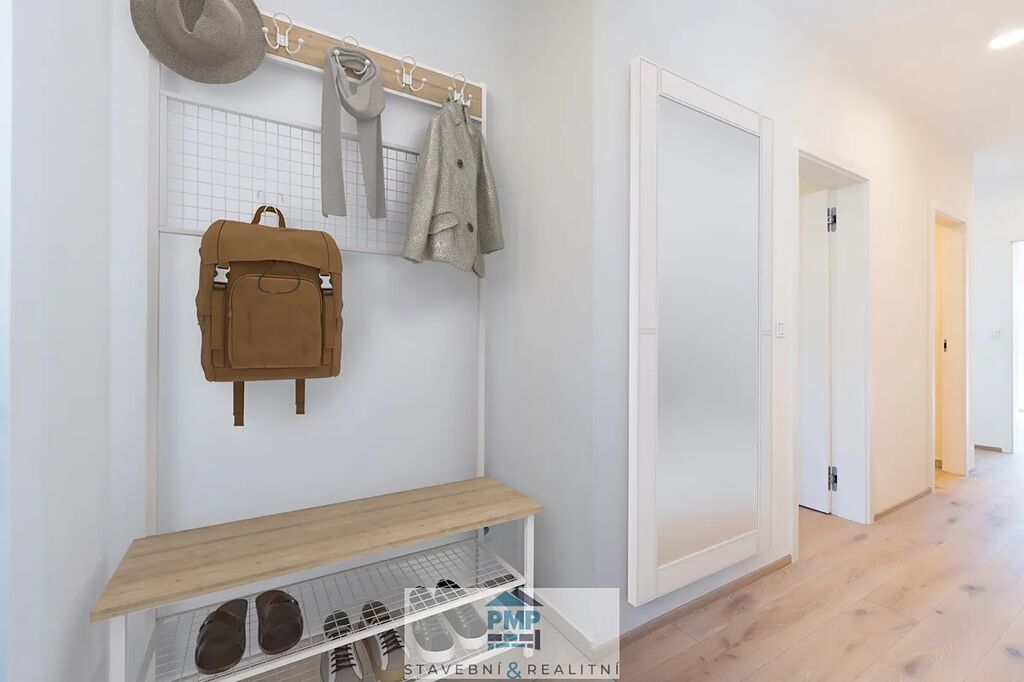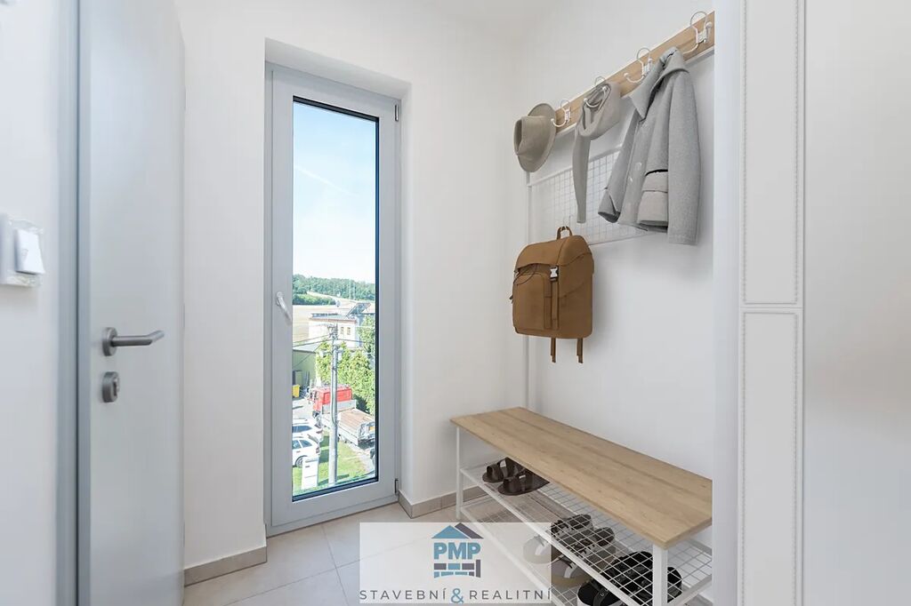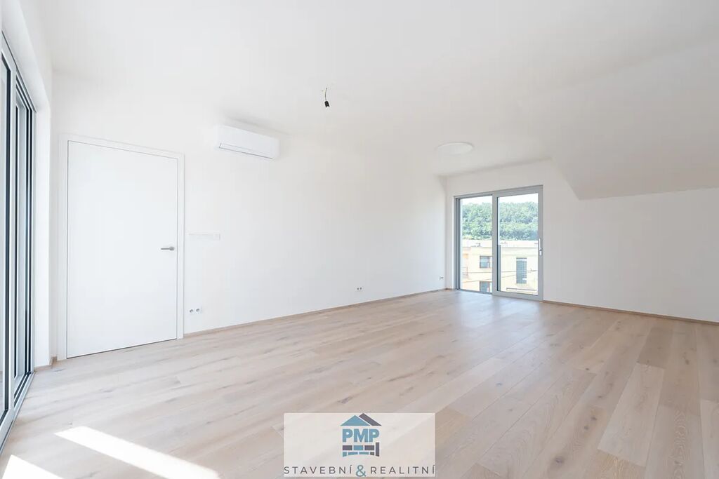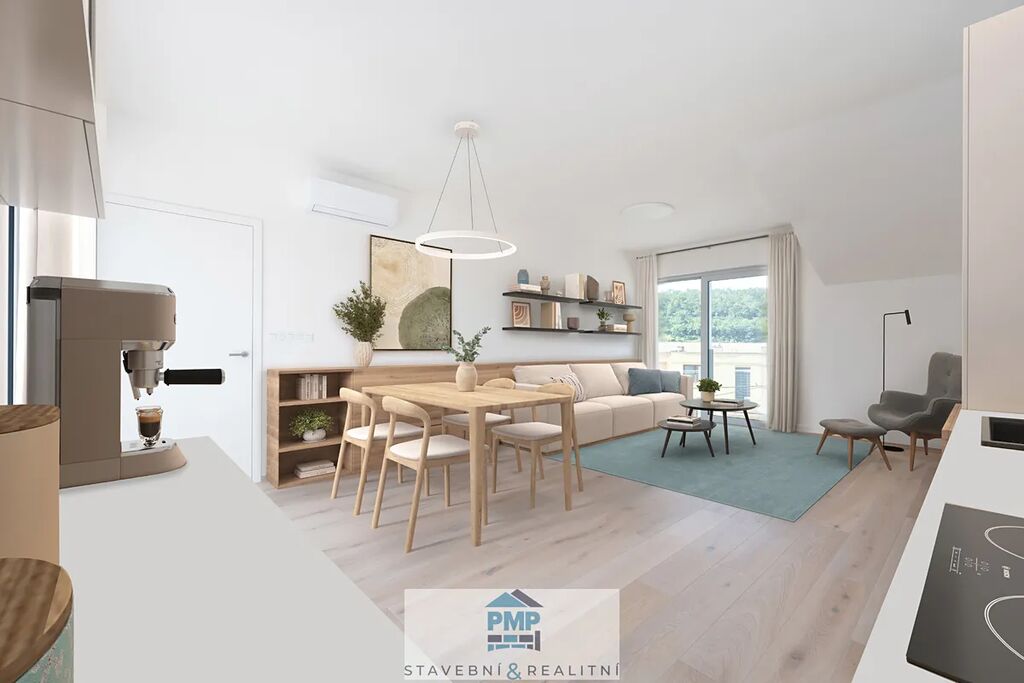 Dispozice bytu zahrnuje světlý obývací pokoj s kuchyňským koutem a vstupem na terasu, dvě ložnice, koupelnu vybavenou velkoformátovým obkladem a sprchovým koutem typu walk-in, samostatné WC a praktickou šatnu. Podkrovní atmosféru doplňují velká střešní okna, která zajišťují dostatek denního světla.