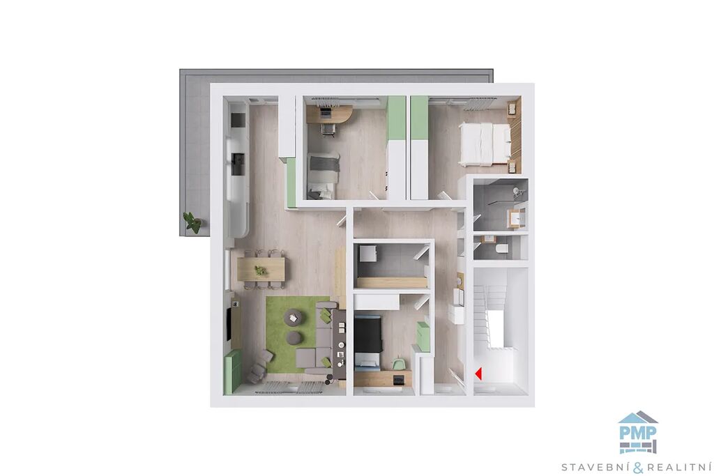 Dominantou bytu je rozlehlý obývací pokoj s kuchyňským koutem a vstupem na L-balkon o velikosti 19 m², který nabízí příjemné posezení a krásný výhled do okolí. Byt dále disponuje třemi ložnicemi, koupelnou s velkoformátovým obkladem, sprchovým koutem typu walk-in, samostatným WC a technickou místností.