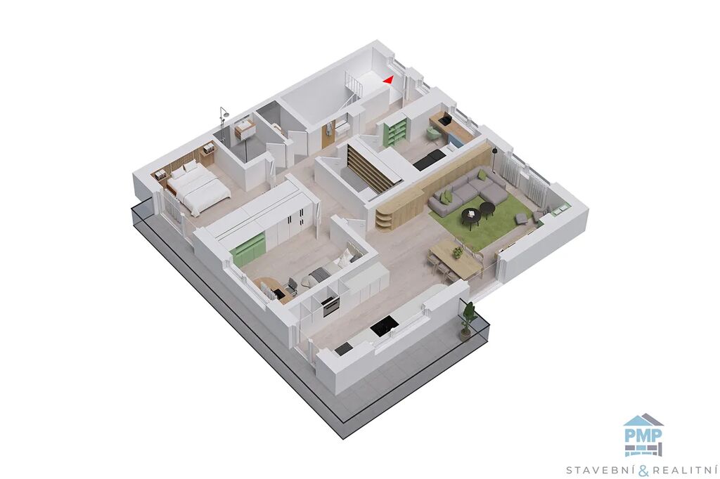 Byt se nachází ve 2. nadzemním podlaží a je největší jednotkou v projektu Rezidenční byty Nebovidy. Jeho výjimečnost spočívá v tom, že je kompletně vybaven nábytkem na míru navrženým architektonickou kanceláří. Všechny prvky byly pečlivě sladěny do harmonického celku – od kuchyňské linky s vestavěnými spotřebiči až po úložné prostory a designový mobiliář. To znamená, že se můžete okamžitě nastěhovat a bydlet bez dalších investic.