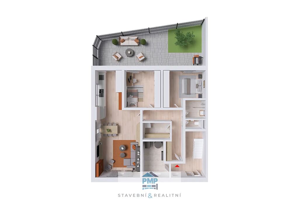 Nabízíme Vám bytovou jednotku o dispozici 3+kk a užitné ploše 90 m², která je součástí projektu Rezidenční byty Nebovidy. Tento projekt zahrnuje pouze tři bytové jednotky, přičemž každý byt se nachází na samostatném podlaží, což zaručuje dostatek soukromí a klidu. Byt v přízemí je plně bezbariérový a jeho hlavním benefitem je prostorná terasa se zahrádkou o velikosti 51,5 m², kde si můžete vytvořit vlastní zelenou oázu – ať už s bazénkem, dětským hřištěm nebo posezením u kávy.