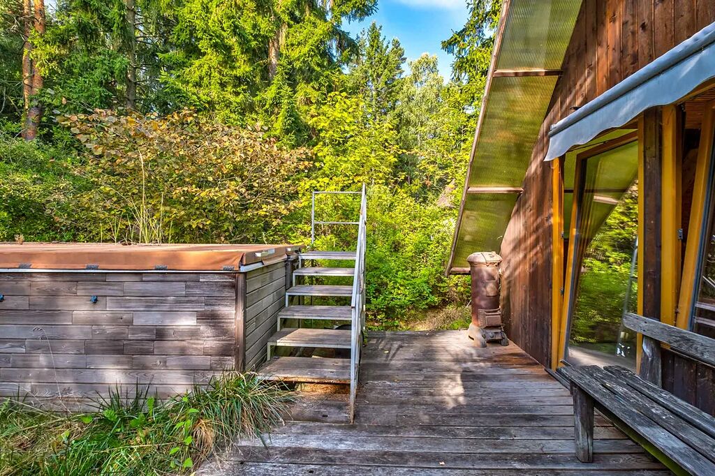 Na zahradě je umístěná vířivka USSPA a dřevěná kolna sloužící pro uskladnění nářadí a dalších potřeb.