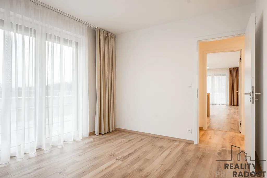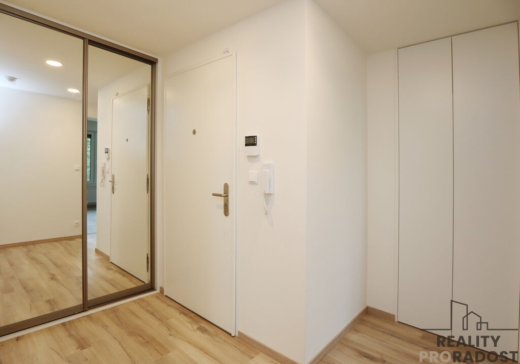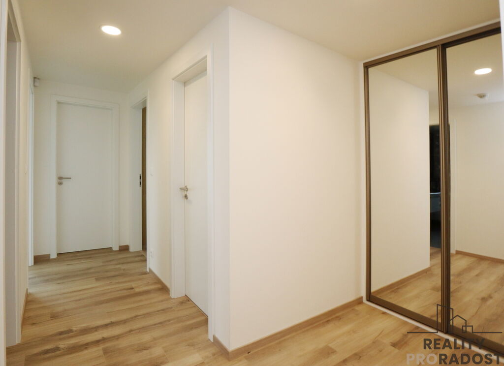 Jednotka se nachází ve 2. podlaží novostavby s výtahem a sestává ze vstupní předsíně, ve které je umístěna šatní skříň vyrobená na míru, dále sestává z obývacího pokoje propojeného s kuchyňským koutem, dvou samostatných ložnic, koupelny s vanou a wc, komory a dalšího samostatného wc. K bytu patří sklepní kóje 2,9m2 a jedno parkovací stání v přízemí domu. Další venkovní vyhrazené stání je možné si pronajmout za poplatek.