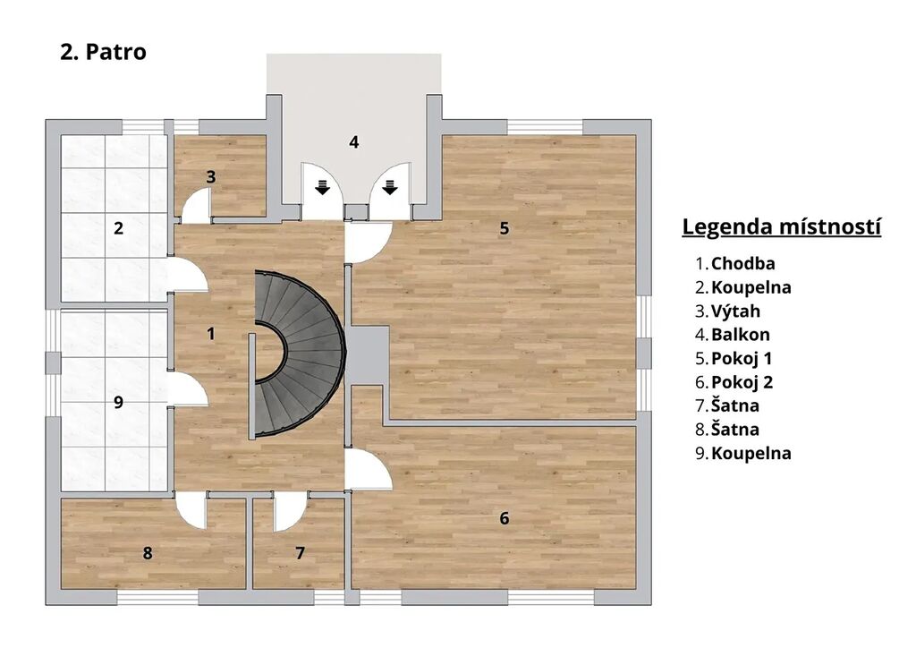 • 2. patro: Dvě samostatné ložnice s koupelnami a šatnami perfektně oddělené pro zachování soukromí každého člena rodiny.