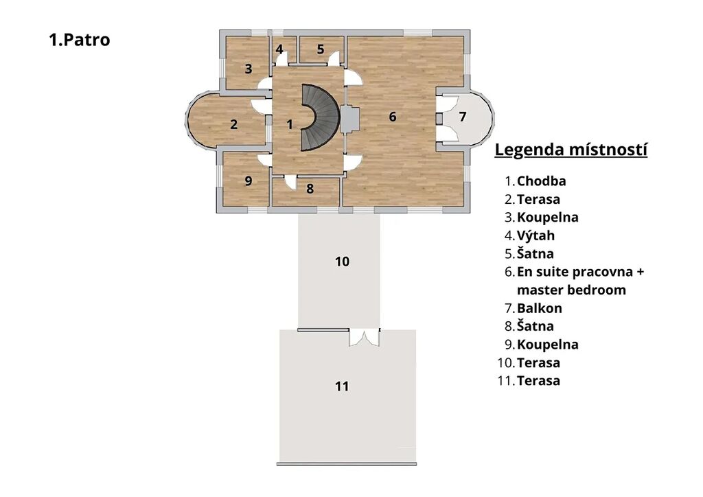 • 1. patro: En-suite pracovna a ložnice s vlastními šatnami a koupelnami, doplňující dvě terasy ideální pro večerní relaxaci pod širým nebem.