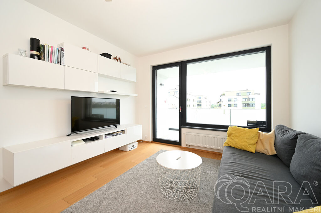 Po vstupu vás přivítá chodba, ze které se dostanete do prostorného obývacího pokoje s moderním kuchyňským koutem. Ten je plně vybaven vestavěnými spotřebiči, mezi které patří lednice s mrazákem, elektrická trouba, sklokeramická varná deska, digestoř a myčka. Součástí obývacího pokoje je i jídelní část s vnitřními žaluziemi. Na balkon o velikosti 11,6 m² je přímý vstup jak z obývacího pokoje, tak i z hlavní ložnice, což nabízí pohodlné propojení obou místností s venkovním prostorem.