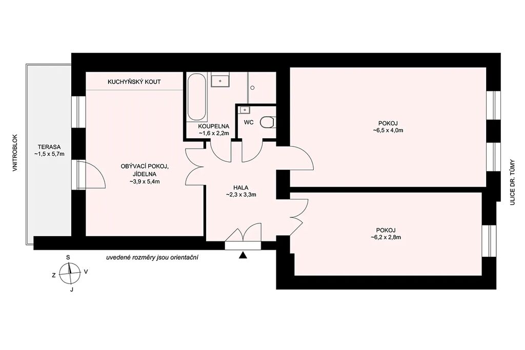 Dispozice bytu se skládá z obývacího pokoje s novou kuchyňskou linkou, která je plně vybavena vestavnými spotřebiči. Dále pak ložnice, pokoj, prostorná vstupní chodba, koupelna se sprchovým koutem a samostatná toaleta.