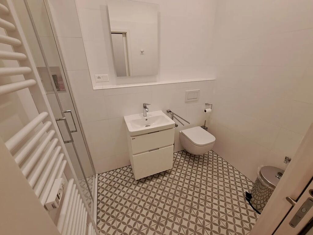 Koupelna s WC je vybavena sprchovým koutem, umyvadlem, zrcadlovou skříňkou, topným žebříkem, WC.