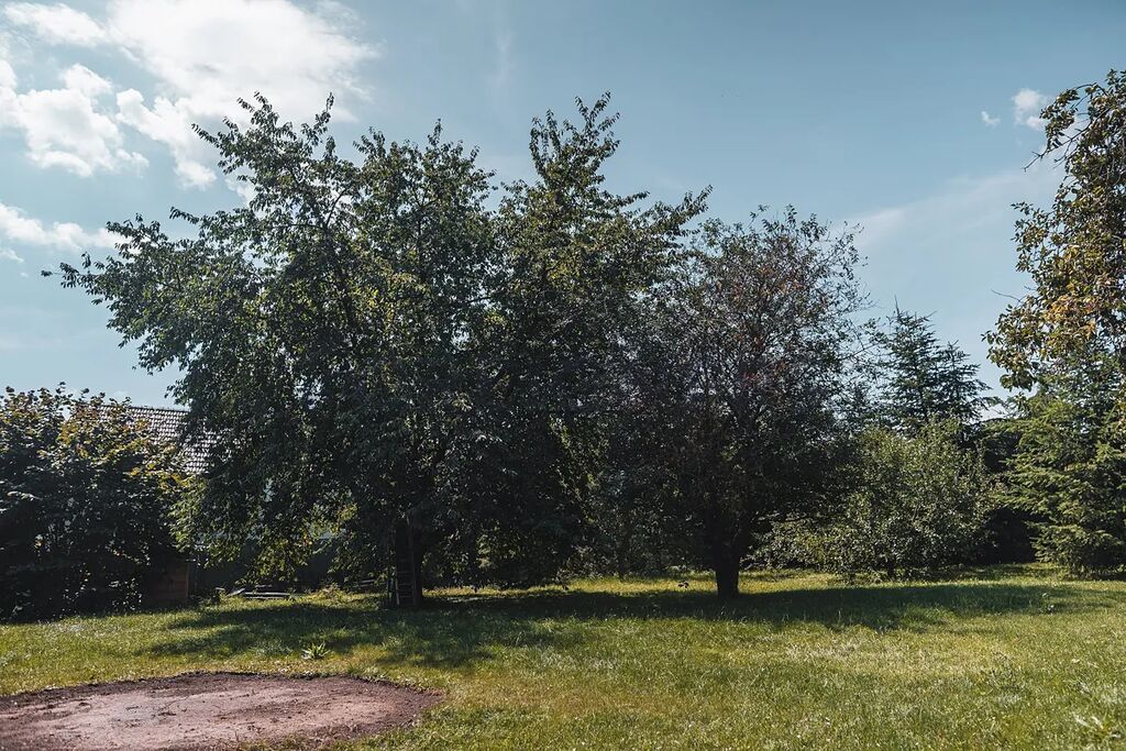 Parcela je orientována na západ až jihozápad, což zaručuje dostatek slunce v odpoledních a večerních hodinách. Terén je převážně rovinatý, mírně svažitý směrem k západu. O soukromí se stará lemování pozemku vzrostlými jehličnany (bělohorka bílá) a přírodní atmosféru dokreslují ovocné stromy – jabloně, třešeň a višeň – které nabízí stín, plody i potenciál pro budoucí zahradu.