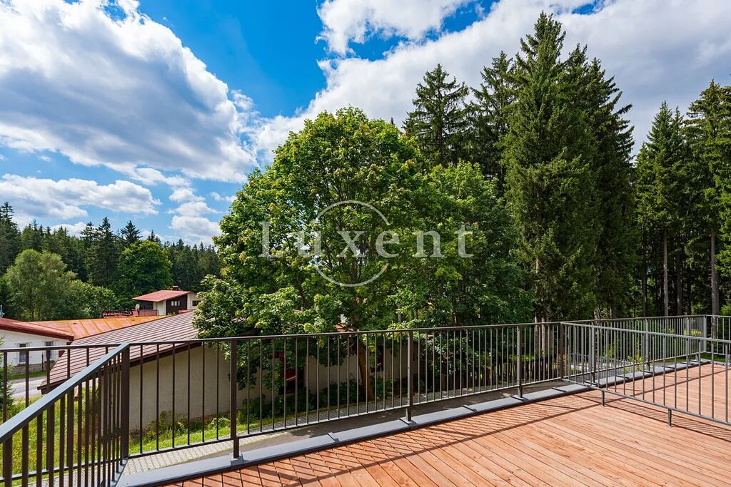Nabízíme plně vybavený apartmán o dispozici 2+kk v 1.NP luxusního projektu HARRACHOV PEAKS. Apartmán má obytnou plochu 52,19 m² a celkovou užitnou plochu 80,16 m² vč. prostorné terasy (27,97 m²). Projekt je dokončen a zkolaudován a byt je jako vzorový vybaven zařízenou kuchyní (spotřebiče BEKO) a skříňovou vestavbou oddělující spací a jídelní kout, která apartmán přibližuje dispozici 2+kk. Rovněž chodba je vybavena vestavěnou skříní a komorou. V suterénu je majitelům apartmánů k dispozici wellness se saunou a vířivkou a vybavené fitness.