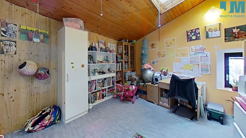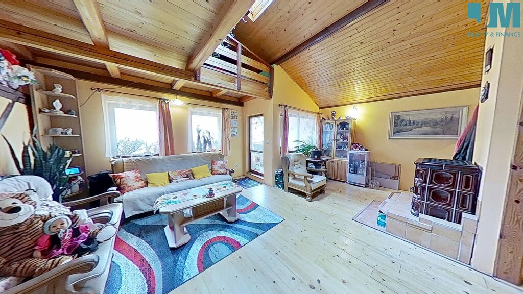 Dominantou bytu je prostorný obývací pokoj s krbem na dřevo, kde se snoubí hřejivé teplo ohně s útulností dřevěných podbitých stropů. Odtud vedou i dveře na balkon s výhledem do klidného vnitrobloku, ideálního pro ranní kávu či večerní posezení. V obýváku se také nacházejí dřevěné schody, které vás zavedou do originálně vytvořeného hracího prostoru – místa, které ocení zejména rodiny s dětmi.