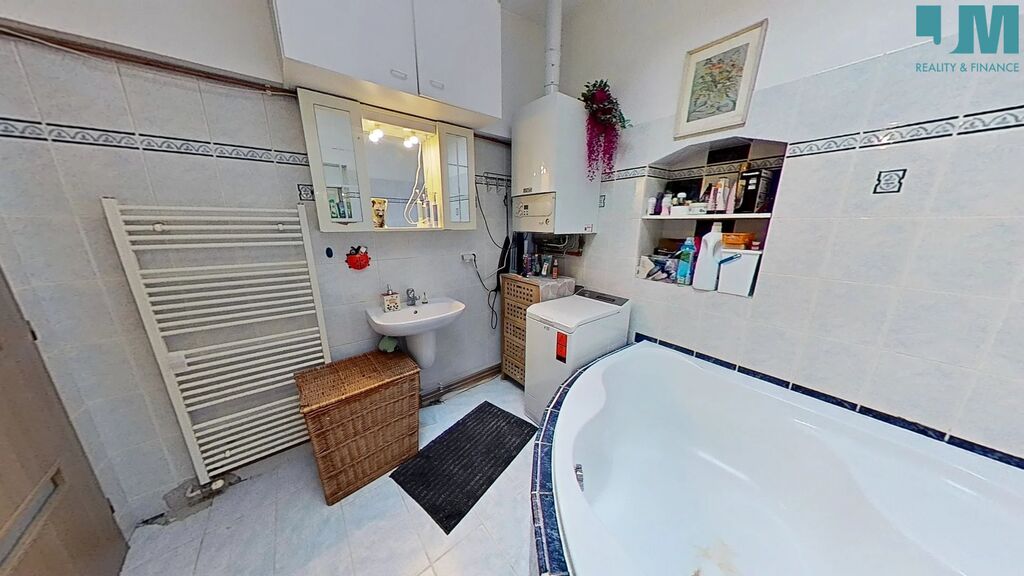 Kuchyně potěší svou velikostí i vybavením – najdete zde kuchyňskou linku, kombi sporák, digestoř a myčku. Koupelna je vybavena vanou, umyvadlem, zrcadlovou galerií, toaletou a plynovým kotlem, který zajišťuje vytápění i ohřev vody. Před bytem se nachází také praktický úložný prostor navíc.