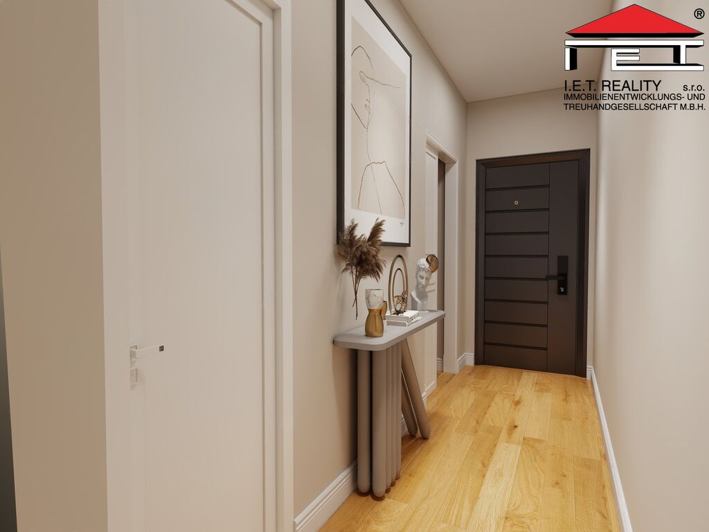 Interiér bytu je navržen v nadčasovém stylu s příjemnými přírodními tóny. Podlahy obytných místností pokrývá vinyl v dekoru dubového dřeva, koupelna a WC jsou obloženy keramickou dlažbou v decentních odstínech šedé s designem betonu. Koupelna je vybavena sprchovým koutem s bezpečnostním sklem, závěsným WC systémem Geberit a moderní černou sanitou značky Nobless. Vstupní dveře jsou bezpečnostní, protipožární, v antracitovém provedení, vnitřní dveře bílé s lakovaným povrchem. Byt má připravené vývody pro kuchyňskou linku (elektřina, voda, kanalizace), centrální vytápění s vlastním měřením a přípravu pro internet a domácí telefon. Zveřejněné fotografie jsou pouze ilustrativní pro představu klienta, jak by se dal byt vybavit.