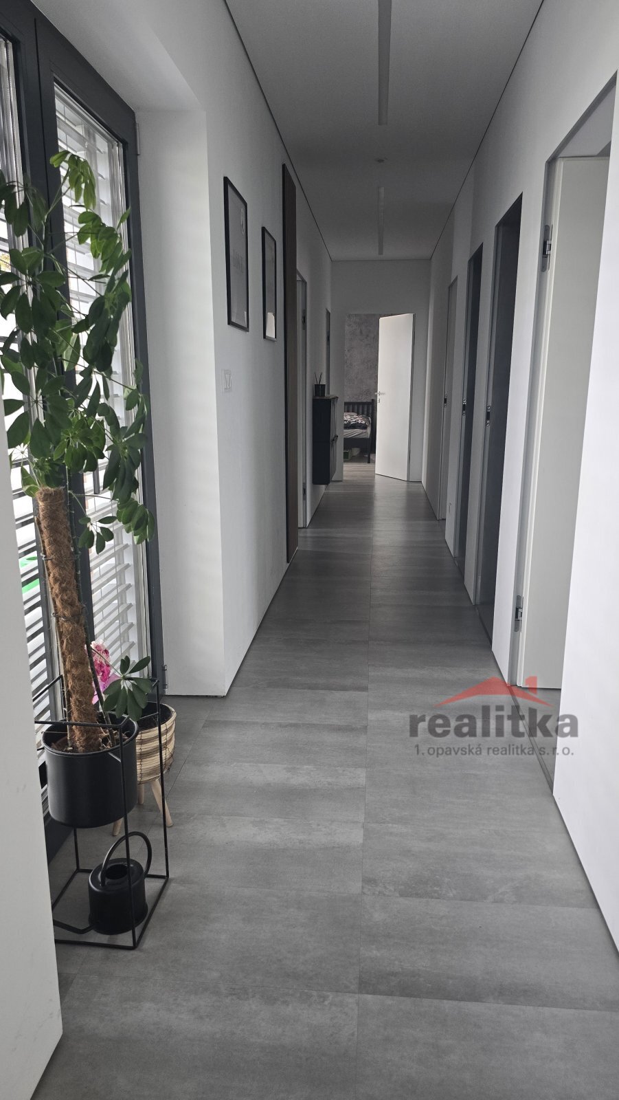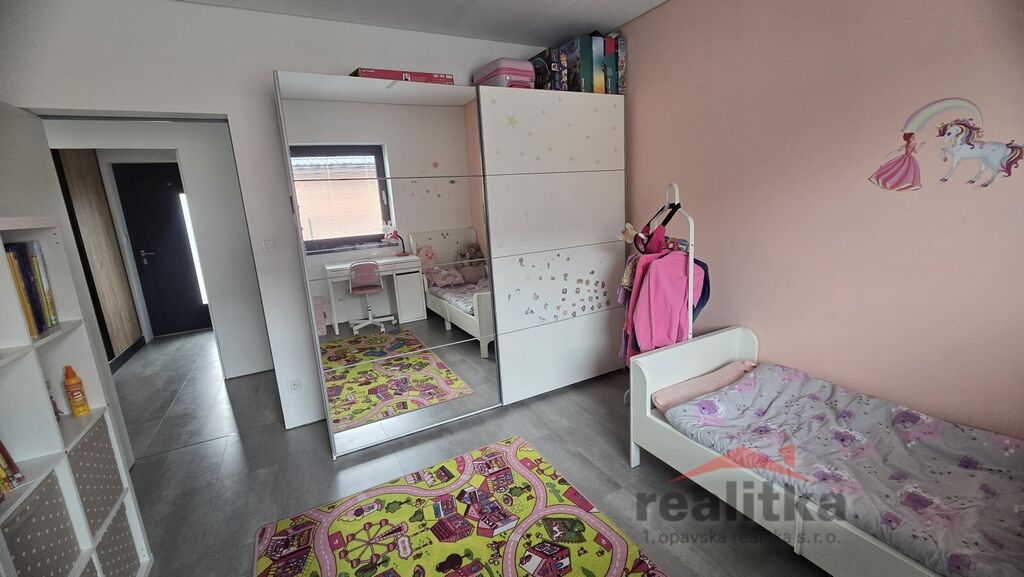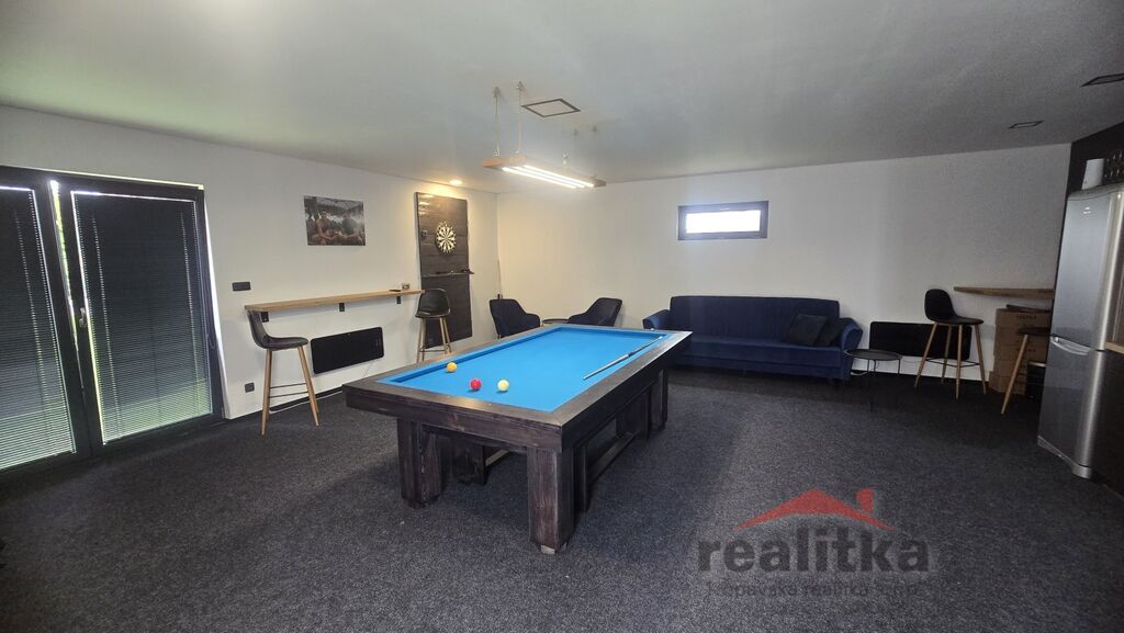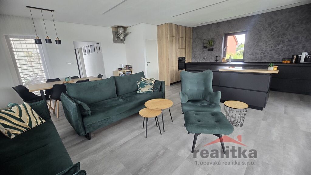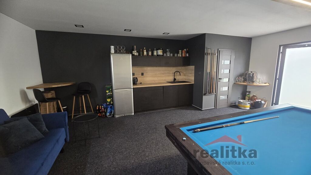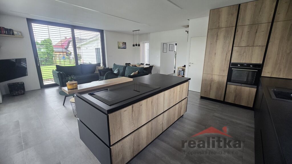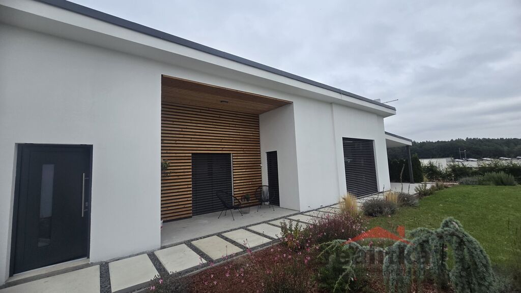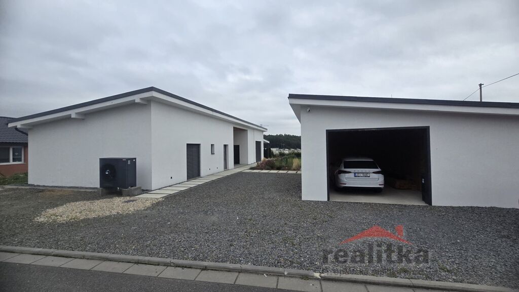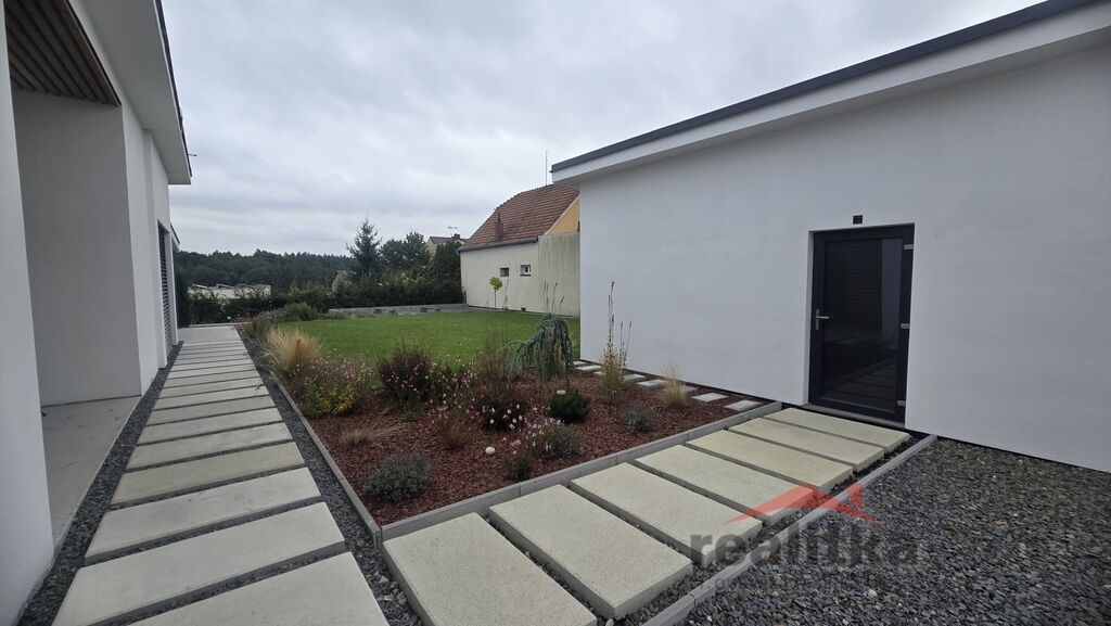 Interiér domu má moderní, kvalitní prvky. V celém domě je liniové zabudované osvětlení, bezobložkové interiérové dveře do všech místností, vinylová bezprahová podlaha, podlahové topení ve všech prostorech domu, betonové designové stěrky, hliníkové okna včetně žaluzií na dálkové ovládání, 2x posuvné terasové dveře - HS portál. Všechny pokoje v domě jsou samostatné se vstupem z předsíně. Ve všech pokojích je pevný internet. Ložnice má vstup do šatny a koupelny, kde jsou 2 umyvadla, wc a sprchový kout. Další koupelna je vedle 2 dětských pokojů, jsou zde opět 2 umyvadla, vana, sprchový kout, další wc je samostatně. Obývací pokoj je spojený kuchyňskou částí a jídelnou se vstupem na velkou terasu s posezením. V obývací části je vše připraveno na zabudování krbu se zkolaudovaným komínem. V prostorné kuchyni je zabudovaná lednice, mrazák, myčka, trouba, mikrovlnka, digestoř a velká indukce a je zde také velká potravinová komora. Obývací pokoj je situovaný na JV stranu, dětské pokoje jsou na stranu severní a ložnice na stranu JZ. Ve vstupní chodbě jsou zabudované skříně a odkládací stěna. Dům je postaven z itongu 37, zateplen 10cm polystyrenem, střecha je Satian - zateplený plech a 50cm izolace. Vytápění domu je tepelným čerpadlem včetně ohřevu vody. V domě je také technická místnost, kde se nachází záložný elektro zdroj, 300l hydrobox, napojení na pračku a sušičku.