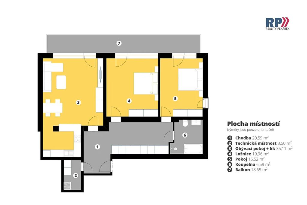 Dispozice bytu je znázorněna na půdorysu a vizualizaci v obrázkové části inzerce. Byt má výměru 102 m2 + balkon 19 m2. K bytu patří 2 parkovací stání a venkovní skladová kóje.