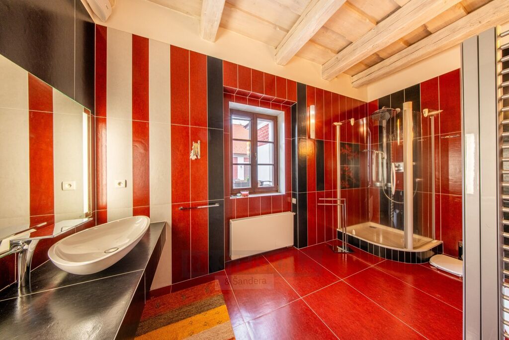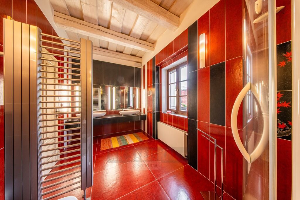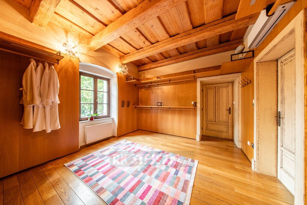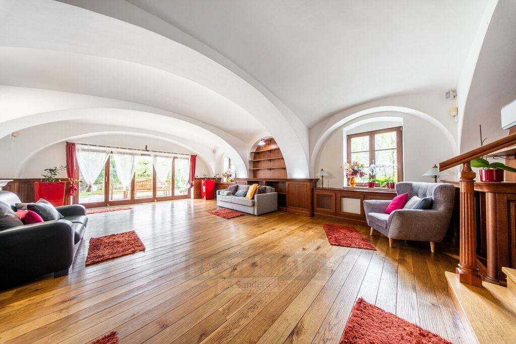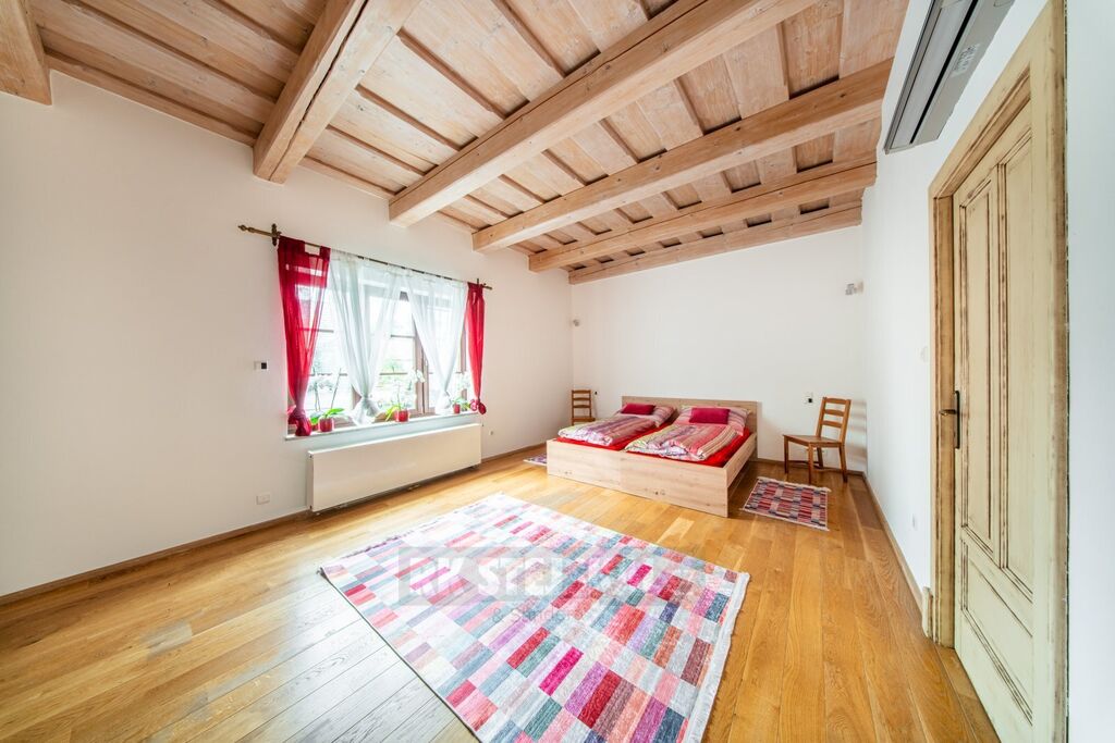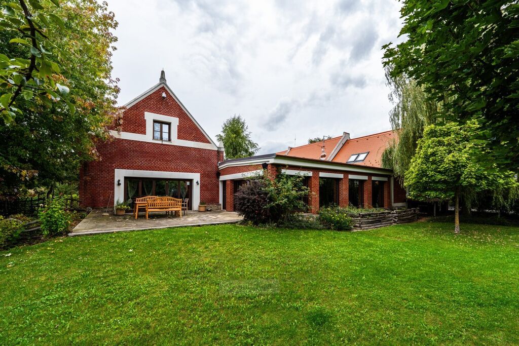 Hlavní stavba - rozlehlá rezidence do U s vnitřním nádvořím, garáže, hostinský byt, technická místnost, kancelář, archiv, serverovna, sociál a kuch. zázemí pro kancelář, bazénová místnost, wellness se saunou a kompletním zázemím, průchozí do RD přízemní části hlavní stavby, kde je  obývací pokoj, kuchyňská místnost s jídelním prostorem, prosklení a vstupy do zahrady a na terasy, šatna, koupelna, komory a WC, ložnice, prostorné zádveří pro hlavní vstup do RD části z nádvoří, vstup do suterénu, hala se schodištěm do patra, v patře vstupní místnost vhodná jako průchozí obývací pokoj, zrcadlově pak dvakrát šatna s koupelnou, samostatná WC a prostorné ložnice, v suterénu domu pak dvě vinotéky a hodovna, dále pak sklepní místnost a samostatné WC,
